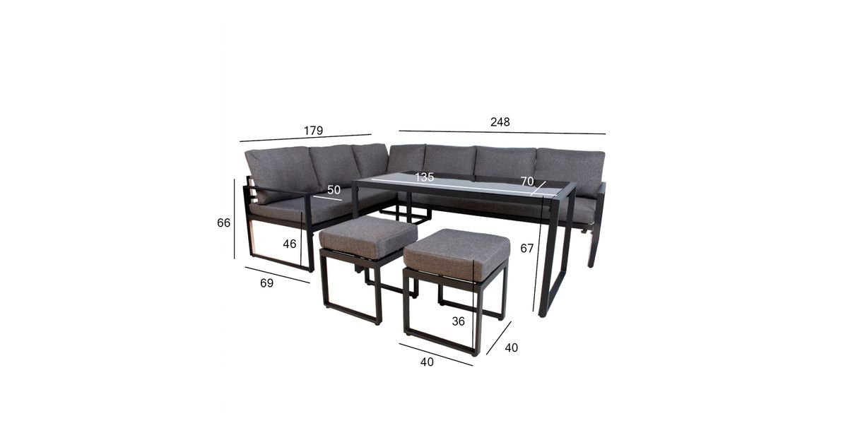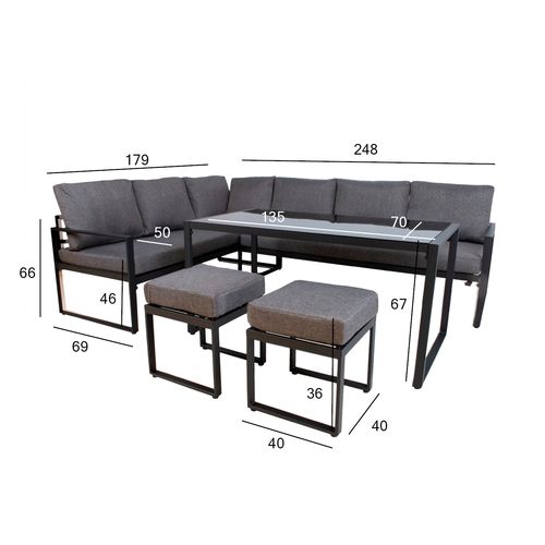 Komplekt LEIPZIG nurgadiivan, 2 tumbat, laud. Komplekti kuuluvad kaks 3-kohalist diivanit, mille saab ühendada nurgadiivaniks. Ühel diivanitest on parempoolne käetugi. Istme ja seljatoe padjad on kaetud polüesterkangaga. Komplekti kuuluvad lisaks kaks tumbat ja diivanilaud. Diivanilaud on kaetud 5mm paksuse klaasiga. Toote raam on valmistatud pulbervärvitud terasest. Diivanite mõõdud on 179x69xH66cm, tumbade mõõdud on 40x40xH36cm, laua mõõdud on 135x70xH67cm.