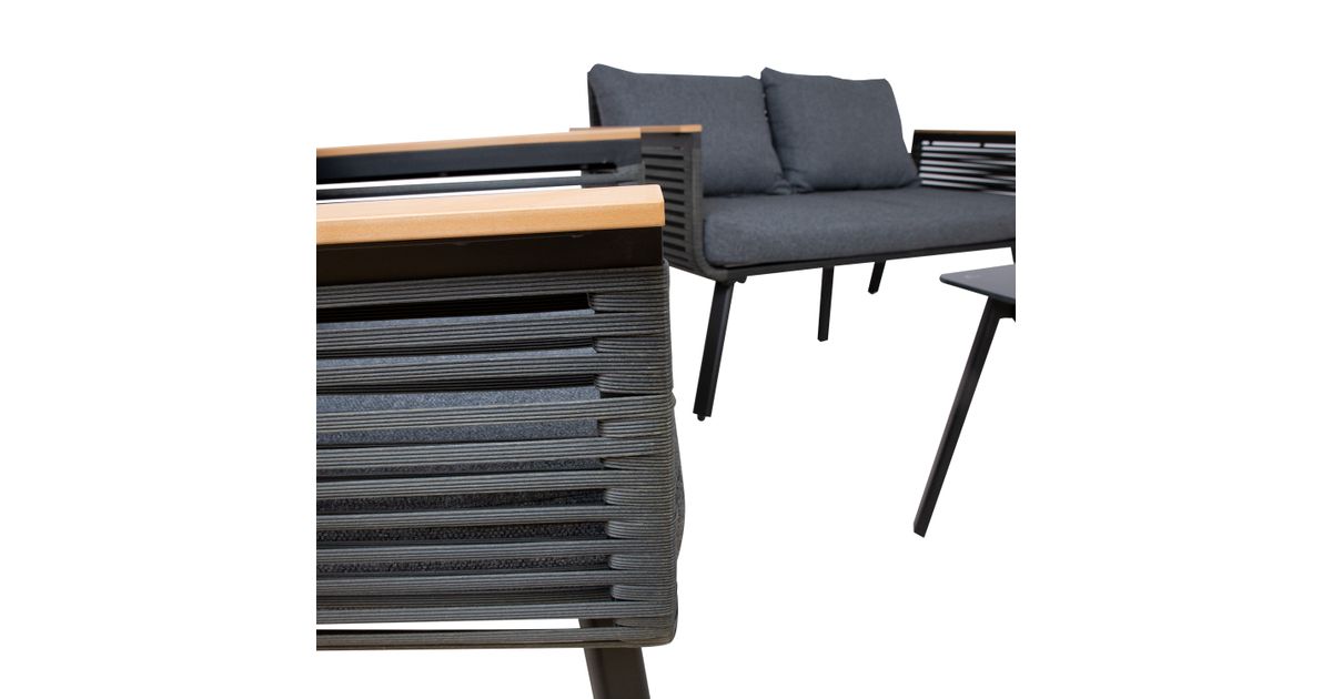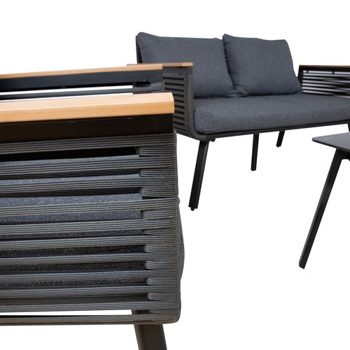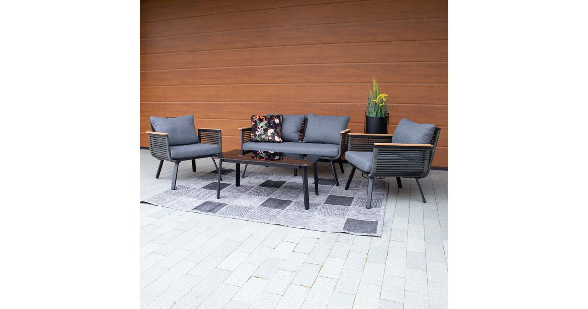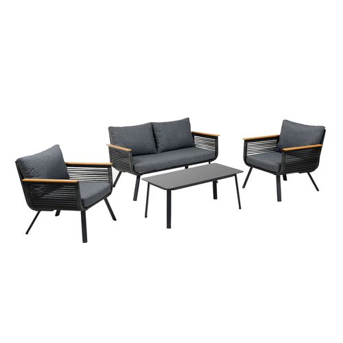 Diivan 129x73xH73cm. Tugitool 71x73xH73cm. Diivani ja toolide raamid ja jalad on valmistatud alumiiniumist ning värvitud musta pulbervärviga. Istmeosa on kaetud musta plastikpunutisega. Käetugedel tiikpuu värvi liistud. Padjad kuuluvad komplekti. Padjakatted: tumehall polüesterkangas. Laud 100x50xH42cm, lauaplaat: must klaas, alumiiniumist jalad ja raam on värvitud musta pulbervärviga.
