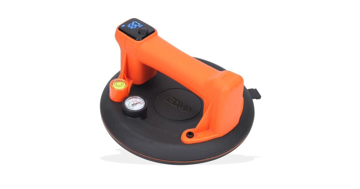Double lip. Digital display for pressure control = safety and reliability. Automatic on/off function : the pump stops when the required pressure is reached. The display then shows 200 kg. Automatic pressure regulation : below 160 kg, the pump switches on and draws vacuum again until 200 kg is reached. Double-click ON/OFF button to release pressure and tab for easy removal. For smooth and rough surfaces. Carrying case and protective cover included. CE certified.