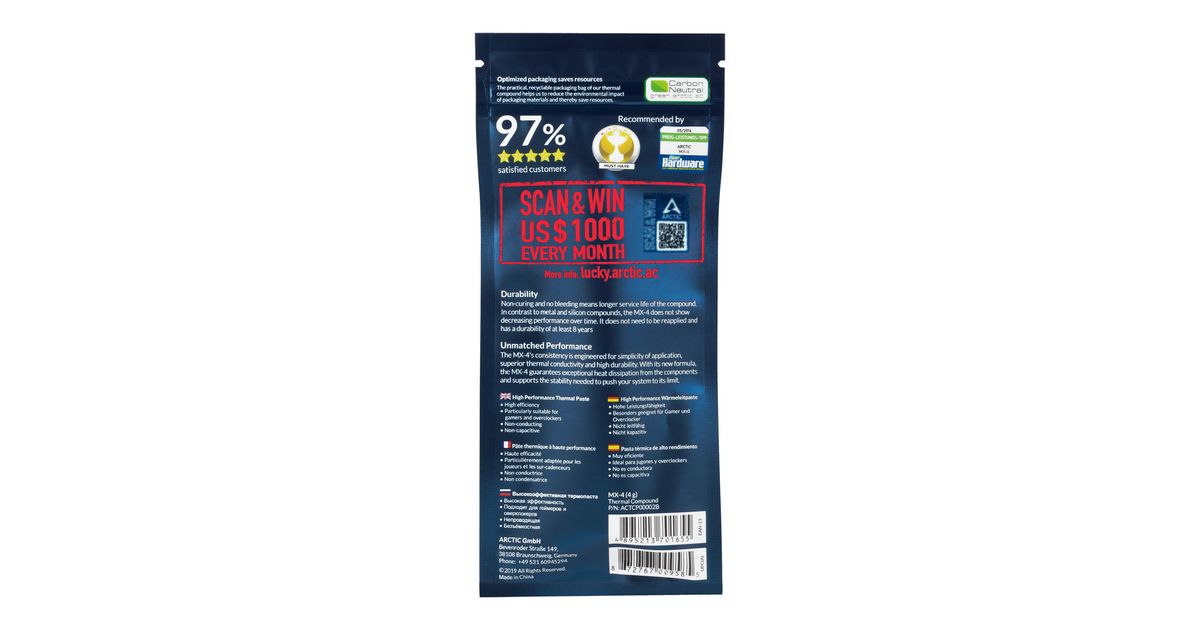 ARCTIC MX-4, 8,5 W/m·K, 2,5 g/cm³, Süsinik, 4 g, 1 tk, 82 mm