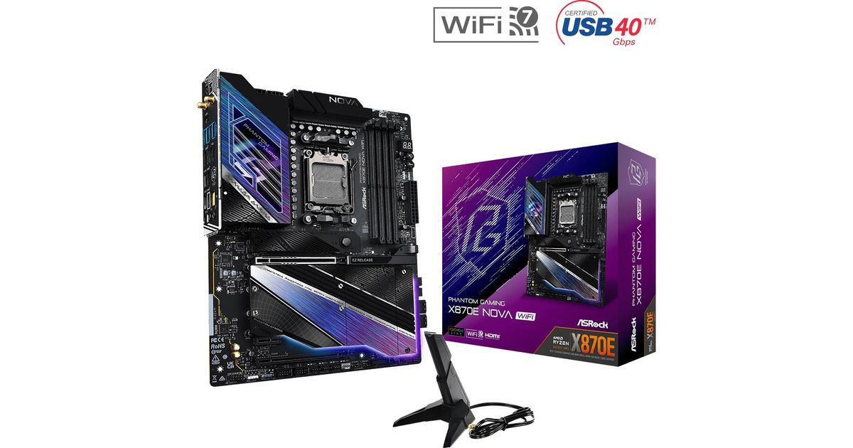 Socket AM5, AMD X870E Chipset, 4 x DDR5-SDRAM up to 256GB, LAN, WLAN, 1 x RJ-45, 4 x SATA III, 1 x M.2(M), UEFI AMI, ATX