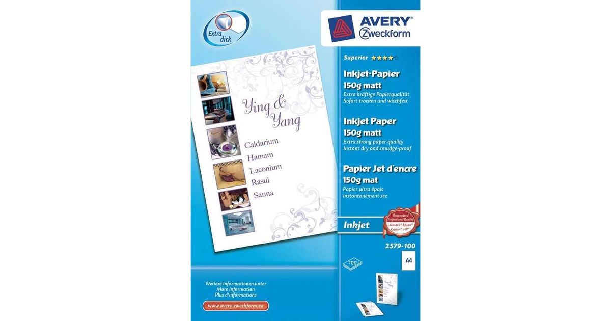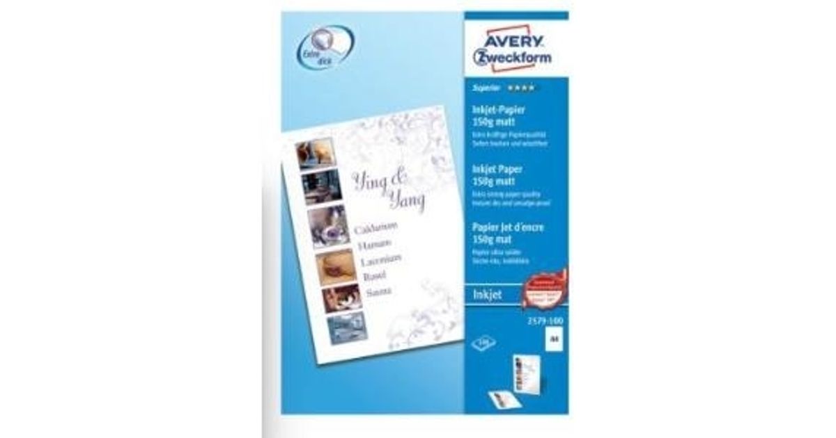Avery 2579-100, Tint, A4, Valge, 100 lehte, Canon, Epson, HP, Lexmark standard inkjet printers, 210 mm