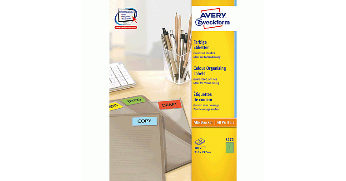 Avery 3472, Roheline, Iseliimuv printerisilt, A4, Paber, Laser/tint, Püsifilter