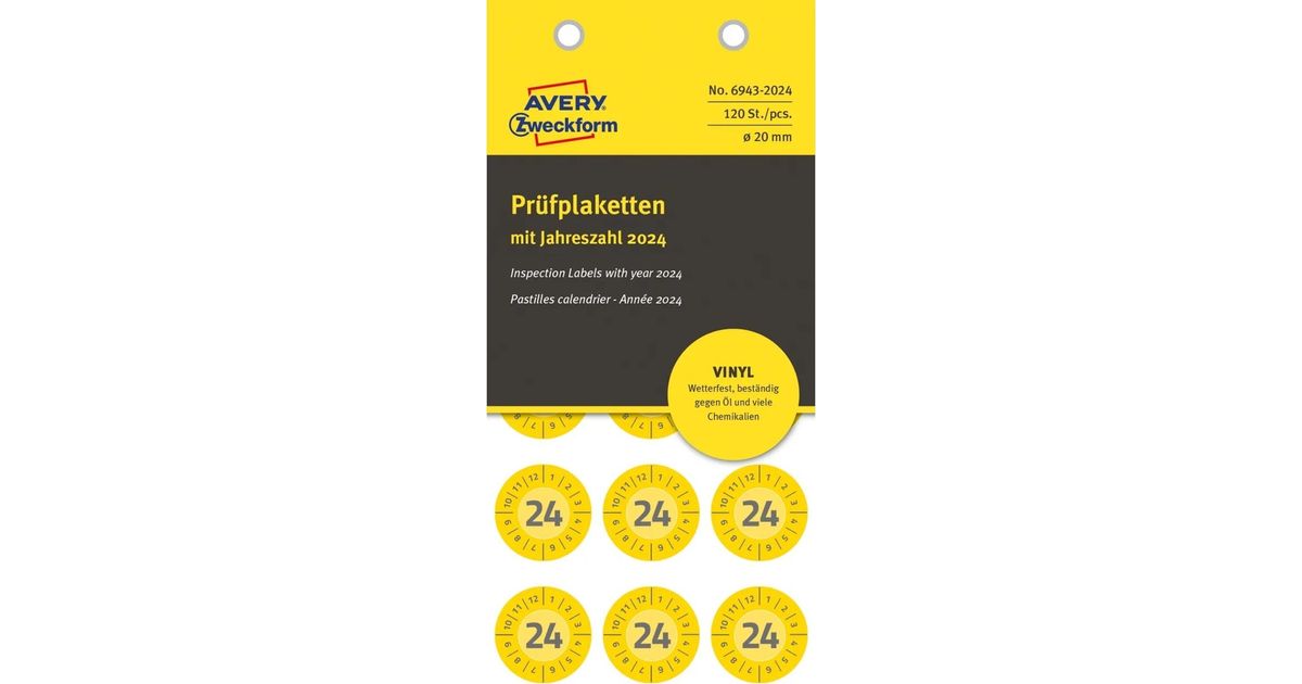 AVERY Avery 6943-2024 Ø 20 mm, 120 Etiketter, Gul Gul 152x70x3,5mm (8stk) - (8 tk mullide emballaaž kohta)