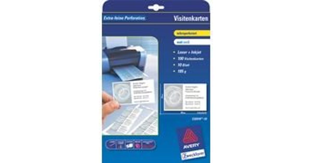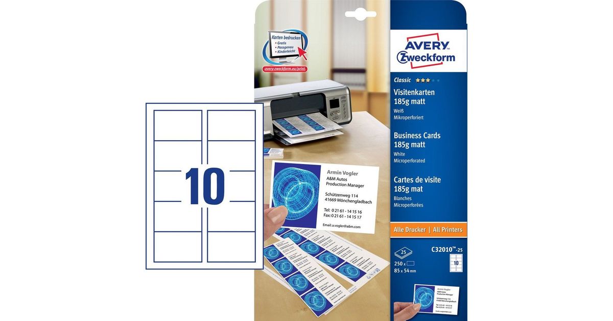 Avery C32010-25, Laser/tint, Papp, Valge, Matt, 185 g/m², 85 mm