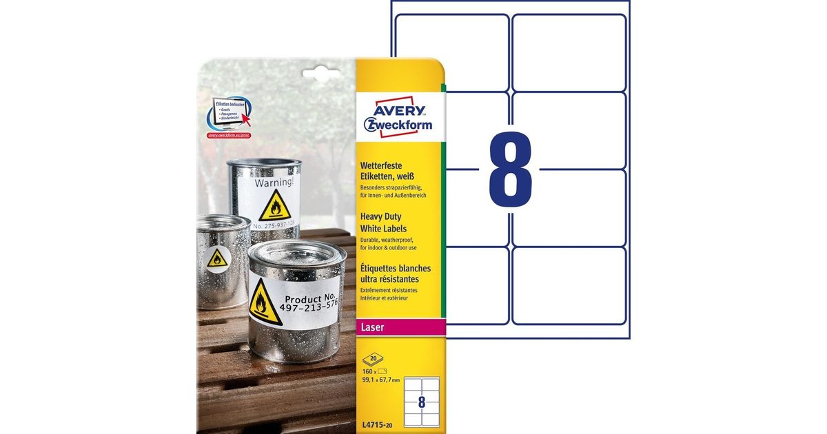 Avery L4715-20, Valge, Ümarate nurkadega ristkülik, Püsifilter, 99.1 x 67.7 mm, A4, Polüester