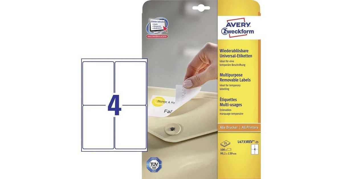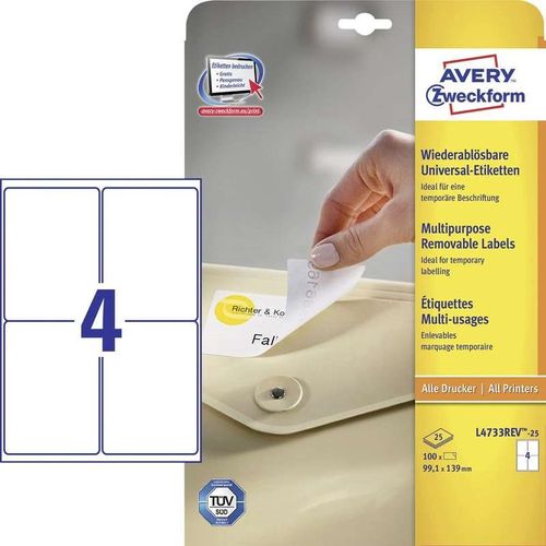 Avery L4733REV-25, Valge, Iseliimuv printerisilt, A4, Paber, Laser/tint, Eemaldatav