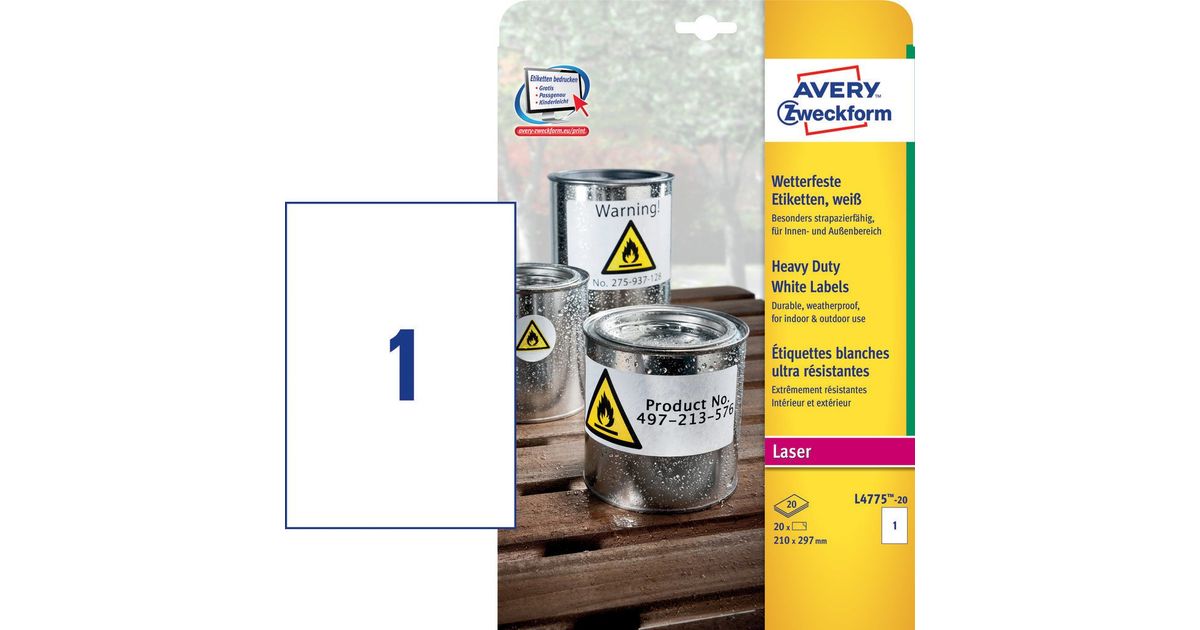 Avery L4775-20, Valge, Ümarate nurkadega ristkülik, Püsifilter, DIN A4, Polüester, Matt