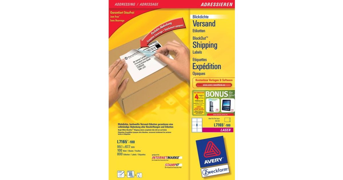 Avery L7165-100, Valge, A4, 99,1 mm, 67,7 mm, 800 tk, 100 lehte