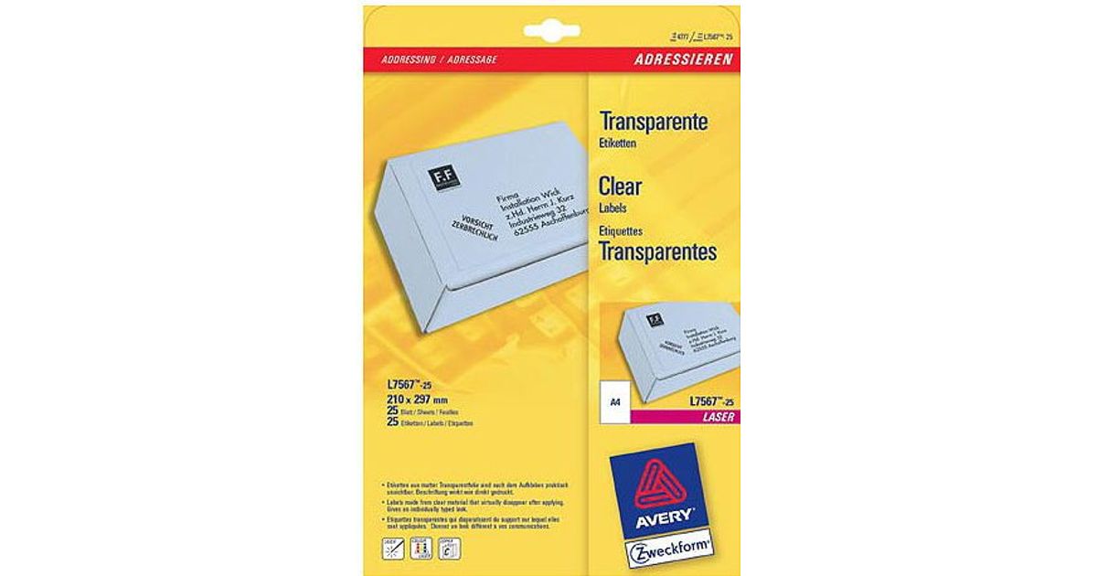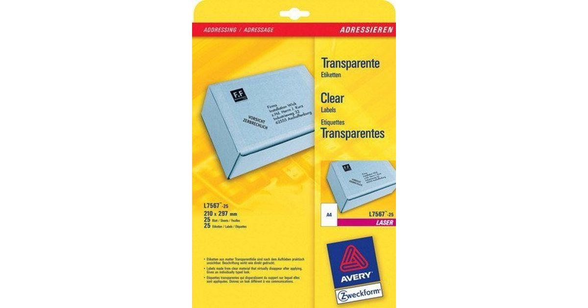 Avery L7567-25, Läbipaistev, Ümarate nurkadega ristkülik, Püsifilter, DIN A4, Polüester, Laser
