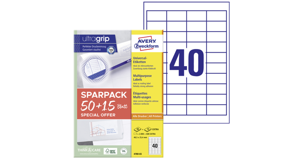 Avery-Zweckform 4780-65 All-Purpose Labels 48.5 X 25.4 Mm Paper White 65 Sheet Permanent Adhesive Inkjet Printer, Laser Printer, Laser, Colour, Copier, Colour