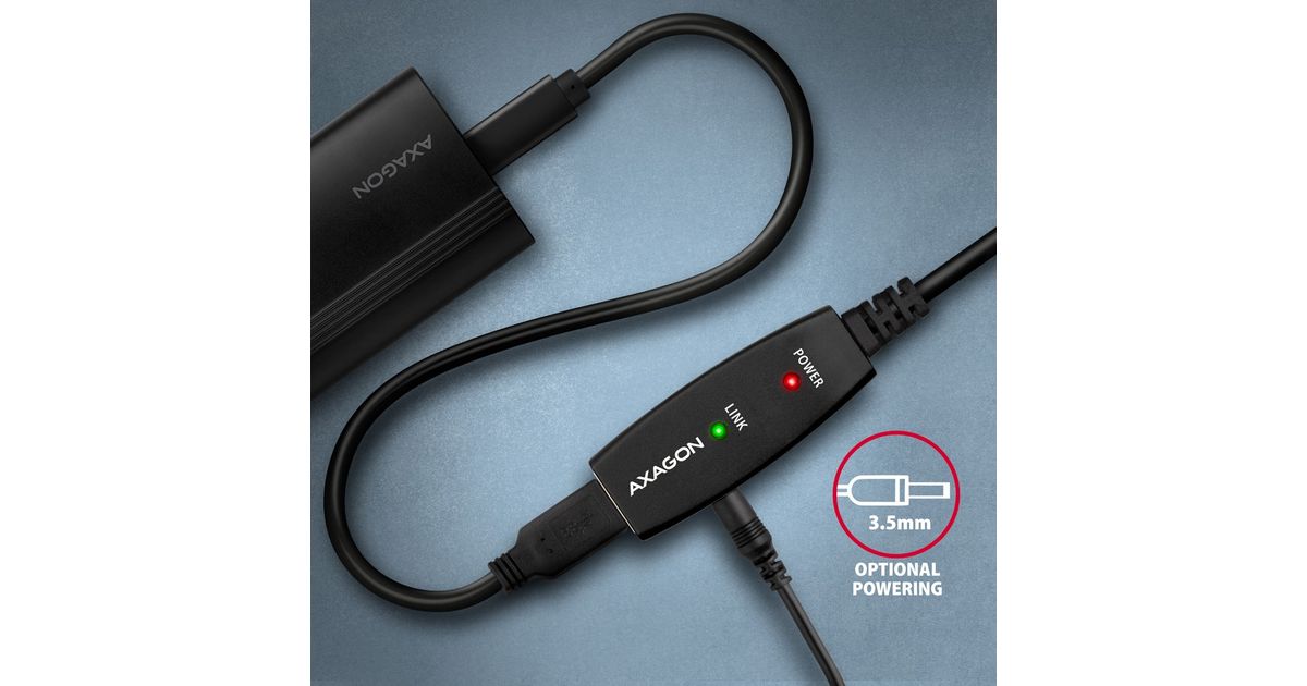The power cable USB A-M / 3.5mm jack, 1.2 m long is included. The cable allows powering from a standard mobile phone charger with USB-A output 5V / min. 1A, e.g. AXAGON ACU-DS16.