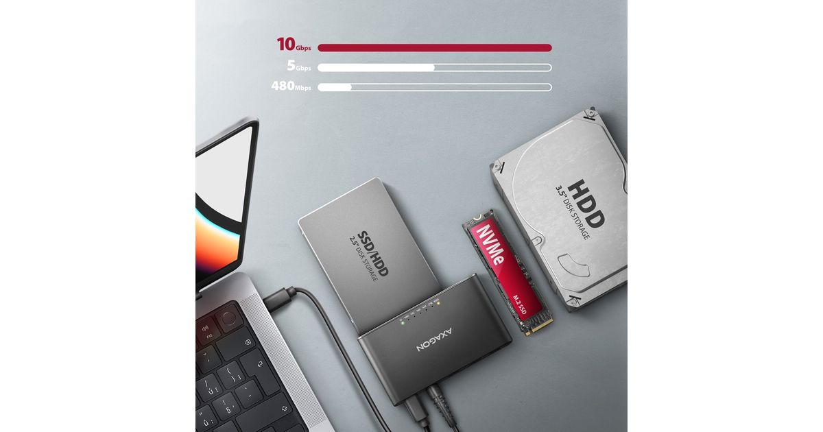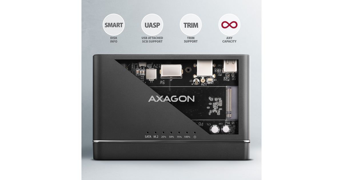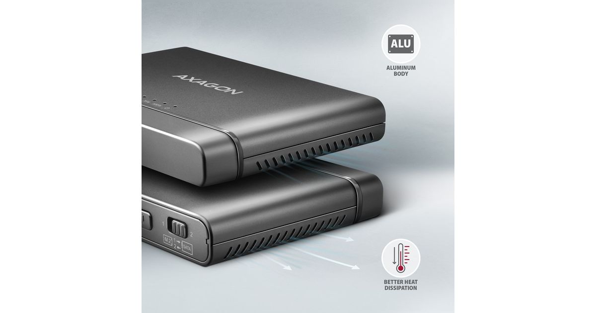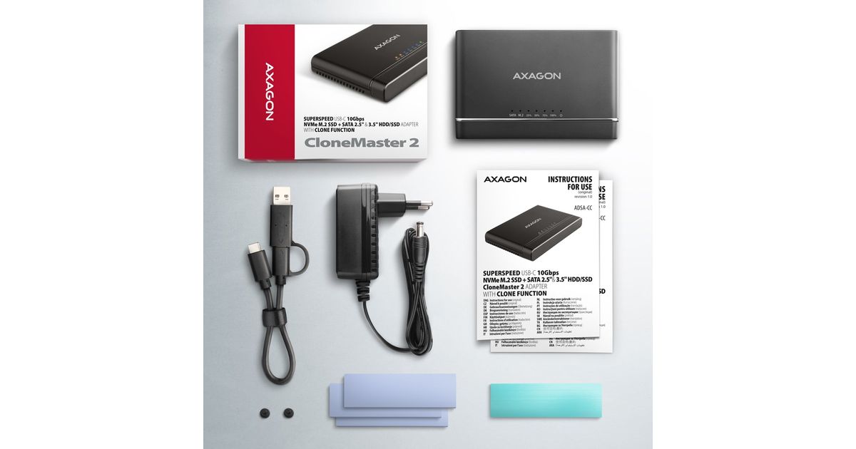 The AXAGON ADSA-CC CLONE MASTER 2 universal USB-C 10Gbps adapter connects up to two drives to your computer quickly and easily at the same time. Easily connect any 2.5" or 3.5" drive directly to the adapter's external SATA connector. Simply insert the NVMe M.2 drive into the adapter body without the use of a screwdriver or other tools. You can also connect a SATA M.2 drive to the adapter using an external adapter such as the AXAGON RSS-M2SD.