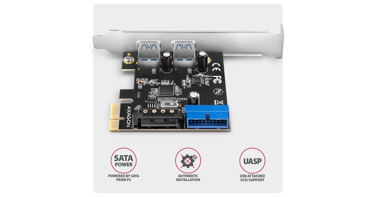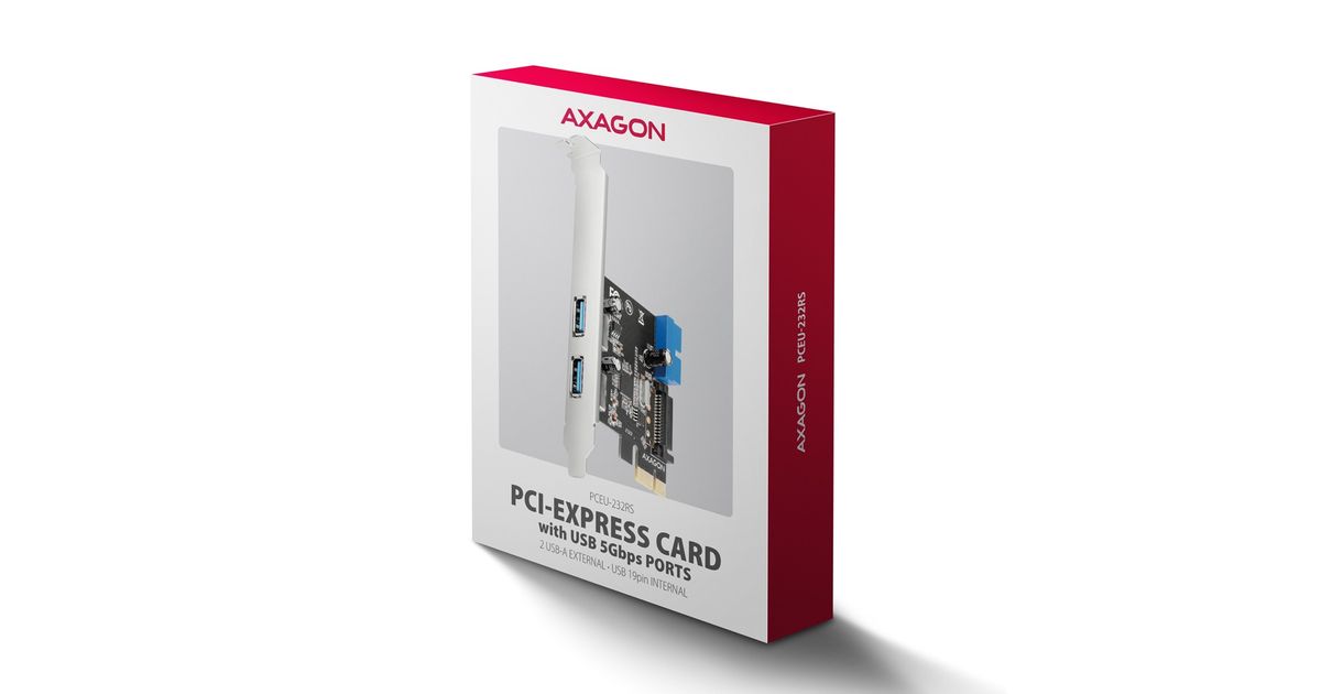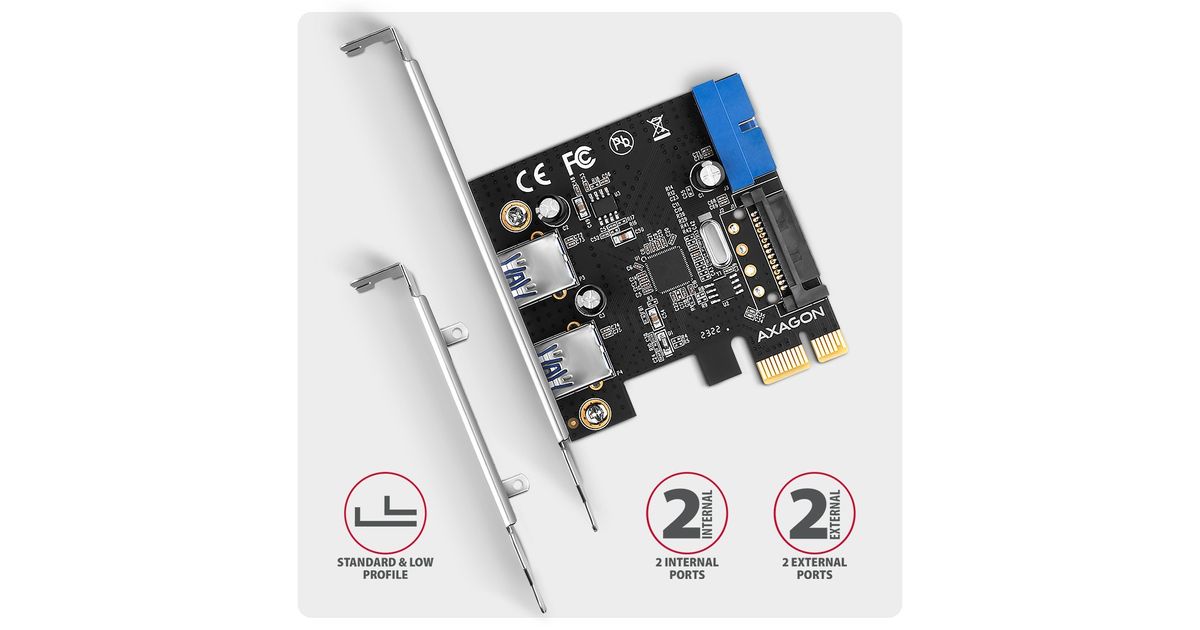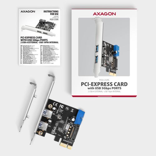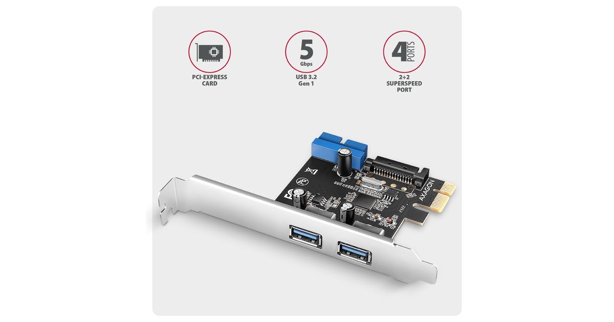 Axagon AXAGON PCEU-232RS kontroller, PCIe kontroller, 2+2x USB 5Gbps port, SATA toiteplokk, Renesas PD720201, SP ja LP