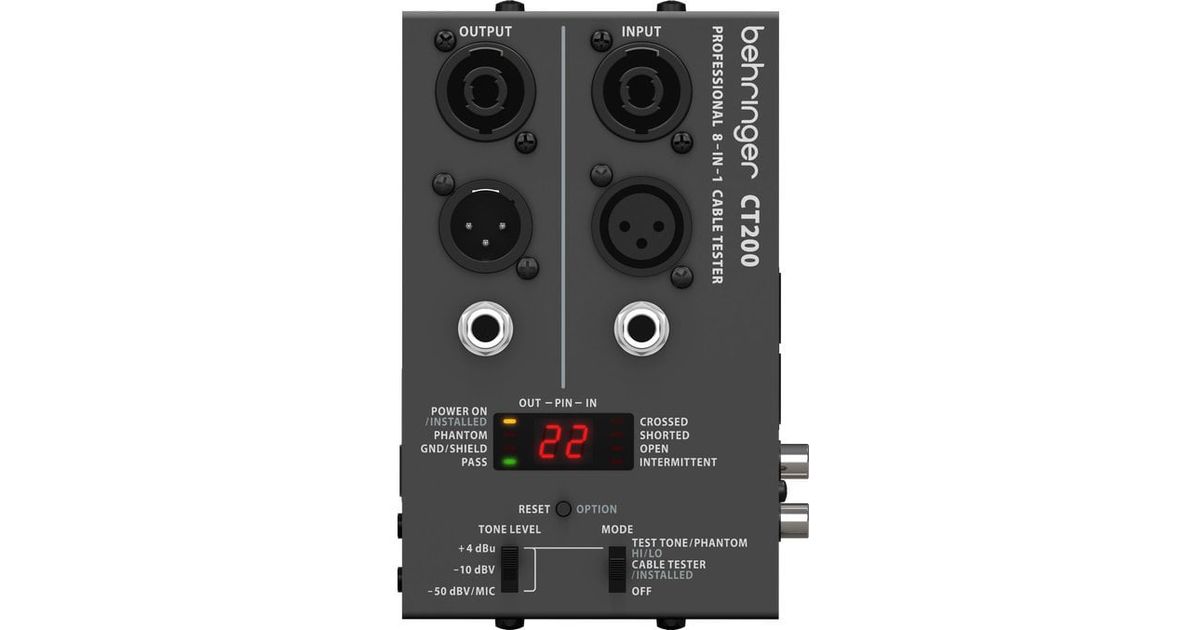 Microprocessor-Controlled 8-in-1 Cable Tester. Make sure every cable in your arsenal is in good working order with the invaluable CT200 Cable Tester. This incredibly portable audio solution is a must-have for sound engineers and musicians alike. The CT200 accepts every type of cable you might use in a recording or live performance situation: XLR, Speakon, TRS ( 1/4 ", 1/8"), RCA, RJ45, MIDI and USB. Choose from 3 diagnostic modes: Cable Test, installed Cable Tester or Tone. The CT200 can check for continuity, intermittent or shorted connections, the presence of phantom power and grounded shields. Because this handy tool runs on two AA batteries, you can carry it in your pocket and be ready to troubleshoot at a moment's notice. The CT200 Cable Tester is the smart, portable and unbelievably affordable way to ensure your next show or recording session runs smoothly. With the trustworthy CT200 in your kit - a faulty cable will never come between you and your audience!