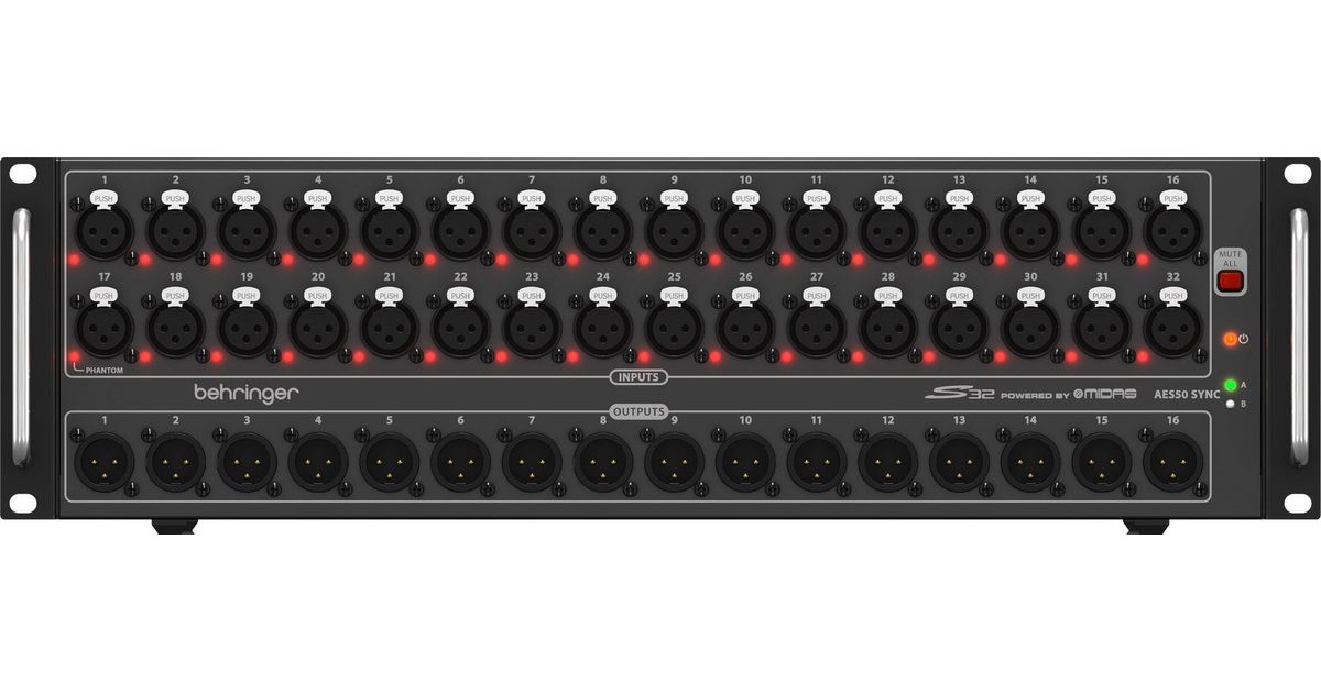 I/O Box with 32 Remote-Controllable MIDAS Preamps, 16 Outputs and AES50 Networking featuring KLARK TEKNIK SuperMAC Technology. Digital mixing has revolutionized virtually everything in the live-entertainment production workflow. The ultra-affordable S32 digital stage box bridges the gap between the onstage talent, Front of House (FOH) console and the rest of the world with its ultra-fast and rock-solid performance! Ever since its formation in the 1970s, MIDAS has had a long history of innovation and leadership in the world of audio mixing consoles. Employed by the most famous touring acts and installations world-wide, legendary MIDAS consoles such as the XL4 and Heritage H3000 quickly became industry standards. MIDAS has earned their impeccable reputation due to their no-compromise approach for audio and build quality and in particular for their Award-winning Mic Preamps which are considered by industry experts as the industry's best sounding designs. Building on this legacy, the XL8 and PRO Series of Live Mixing Systems continue this great heritage of Award-winning audio quality. The S32 was initially designed with our flagship X32 Digital Mixing Console in mind, but any mixing board with AES50 networking capability can still tap directly into the S32's powerful feature set. For instance, an S32 and X32 CORE can be used to create an amazing power-combo for remote-controlled digital mixing in only 4U. While the X32 CORE may be used to run an independent monitor mix, it can also relay and share all I/O with the FOH - whether you are using an X32 Series console, or any other digital mixer that supports MADI, Dante, ADAT or AES50 I/O. We off er very reasonably priced option cards to replace the standard 32 x 32 channel USB interface for exactly that purpose. You can even choose to run the complete show from the stage rack's X32 CORE via our remote control apps. And since the S32 and X32 CORE communicate via AES50, they don't even have to live in the same physical rack, but can be separated by up to 100 m (328') of CAT5 cabling, if that is more convenient for your venue. Features 32 MIDAS-designed, fully programmable mic preamps for audiophile sound quality 16 analog, servo-balanced XLR outputs AES50 network ports featuring KLARK TEKNIK's SuperMAC networking capability for ultra-low jitter and latency ULTRANET Connectivity for BEHRINGER's P16 personal monitoring system for in-ear applications Digital audio and control connectivity for TURBOSOUND speaker systems with ULTRANET networking capability Automatic AES50 stage-split mode when connected between BEHRINGER X32 Series FOH and monitor consoles Dual AES50 ports for cascading additional S16, SD16 or SD8 stageboxes-no merger or router required 2 AES-3 ports (AES/EBU), for directly connecting PA system controllers with digital inputs Dual ADAT outputs providing 16-channel digital output on two optical TOSLINK* connectors Mute All function for quietly patching any inputs on stage MIDI In/Out for bi-directional communication between BEHRINGER X32 Series console and on-stage MIDI devices Remote operation via shielded CAT5e cable up to 330 ft / 100 m length USB connector for system updates via PC "Planet Earth" switching power supply for maximum flexibility (100 - 240 V~), noise-free audio, superior transient response plus low power consumption for energy saving "Built like a tank" yet compact, all-steel 3U rack-mount chassis 3-Year Warranty Program* Designed and engineered in Germany