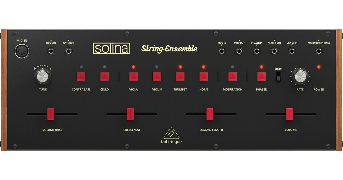 Classic Analog String Ensemble Synthesizer with 49-Voice Polyphony, BBD Chorus Ensemble, Vintage Phase Shifter and Eurorack Format. The Behringer SOLINA STRING ENSEMBLE features violin, viola, trumpet, horn, cello and contrabass instruments as well as controls for tuning, crescendo, bass and volume just like the original revision B. It achieves its iconic multi-orchestral sounds through divide-down technology albeit in a more compact enclosure you can easily integrate into your setup. Within the SOLINA STRING ENSEMBLE is integrated a multi-stage Bucket Brigade chorus that closely replicates the original modulation sound. It comes with comprehensive MIDI implementation, channel and voice priority selection, as well as modulation outputs.