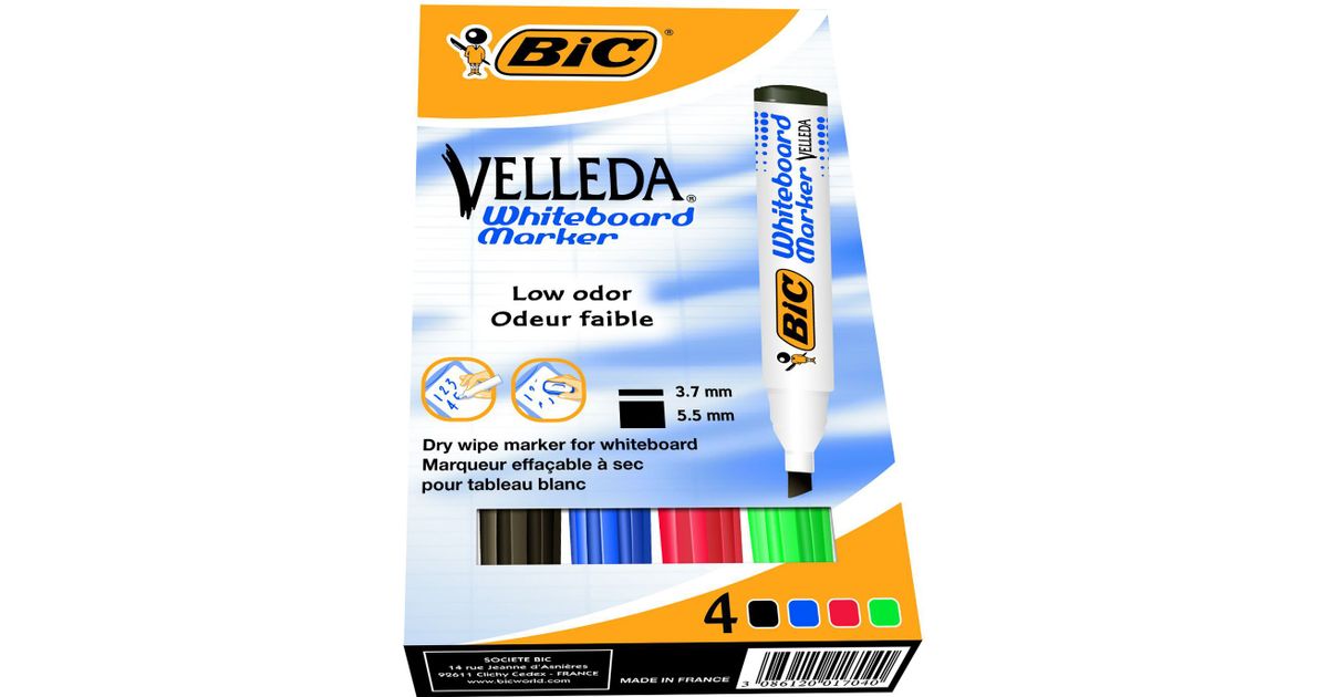 BIC Velleda Whiteboard Marker 1751, 4 tk, Must, Sinine, Roheline, Punane, Peitli otsak, Must, Sinine, Roheline, Punane, Valge, Ümmargune, Alkoholipõhine tint
