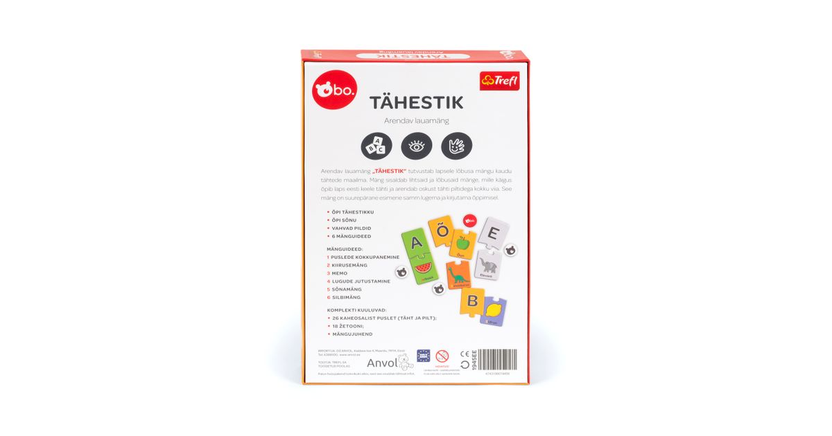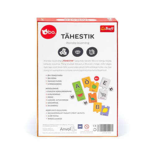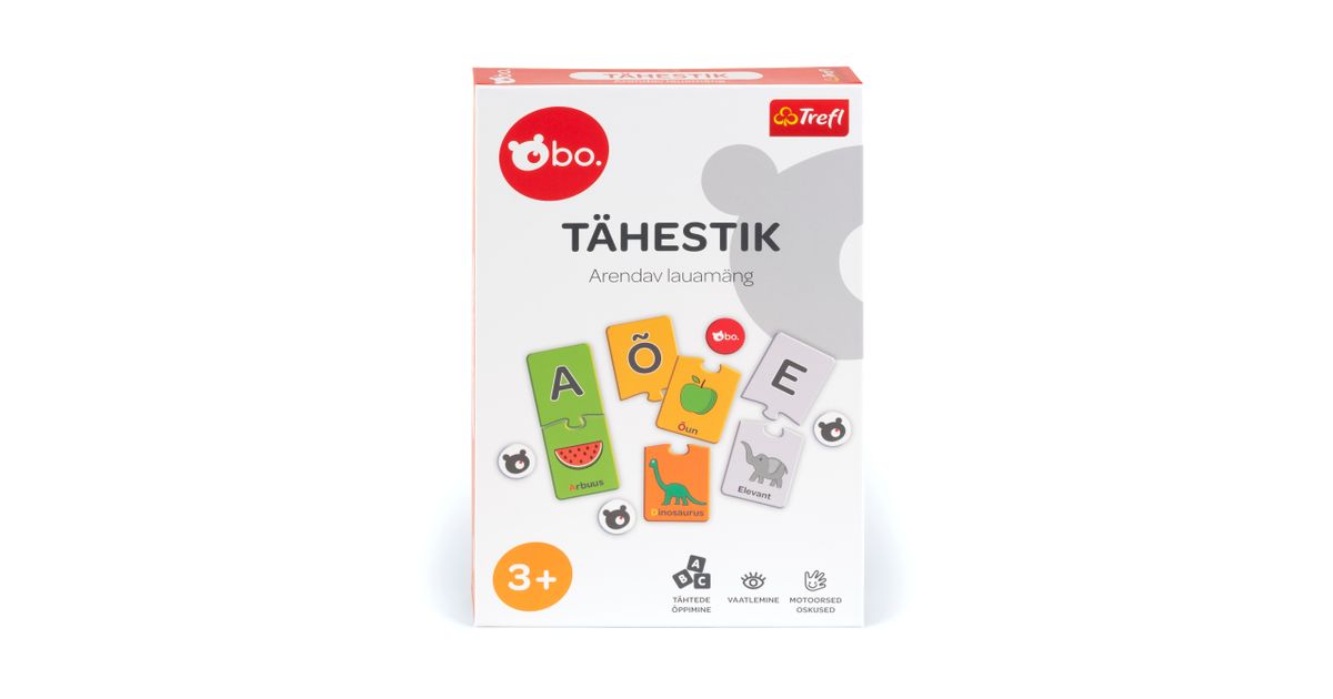 bo. "Tähestik" on hariv pusle, mis tutvustab lapsele lõbusa mängu kaudu tähtede maailma. Mäng sisaldab lihtsaid ja lõbusaid mänge, mille käigus õpib laps eesti keele tähti ja arendab oskust tähti piltidega kokku viia. See mäng on suurepärane esimene samm lugema ja kirjutama õppimisel.
