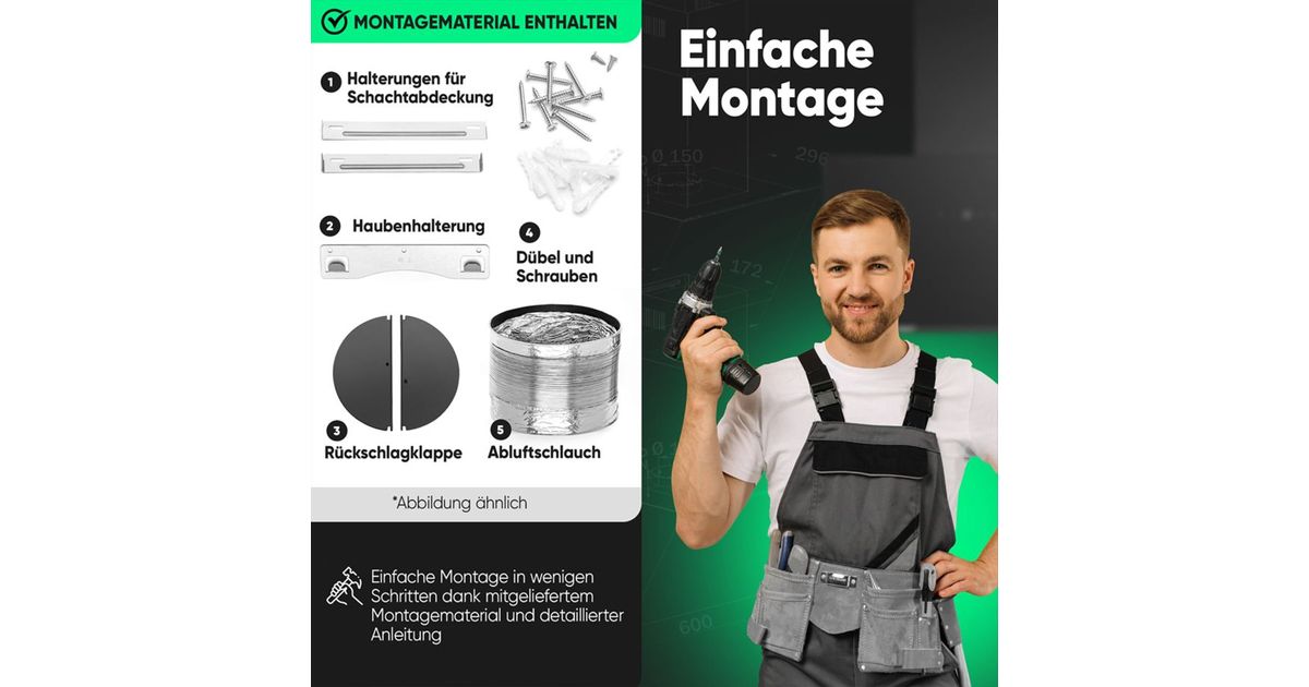 - Including exhaust air hose and fastening material