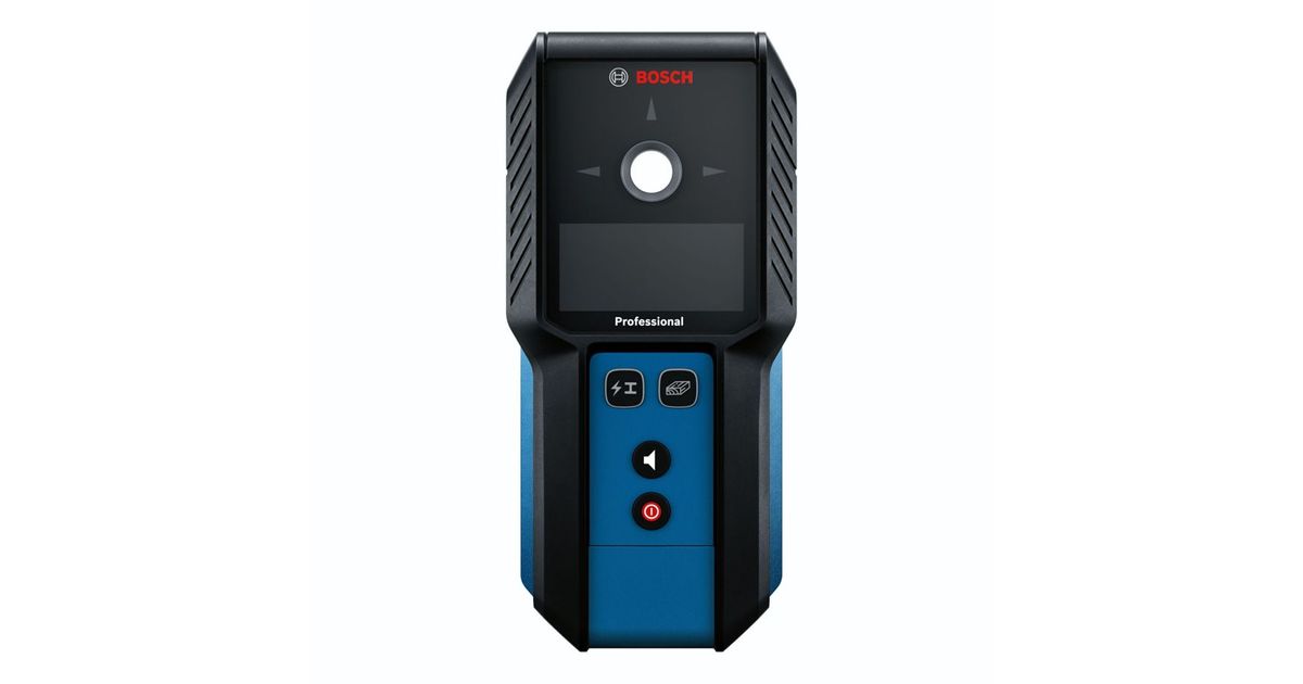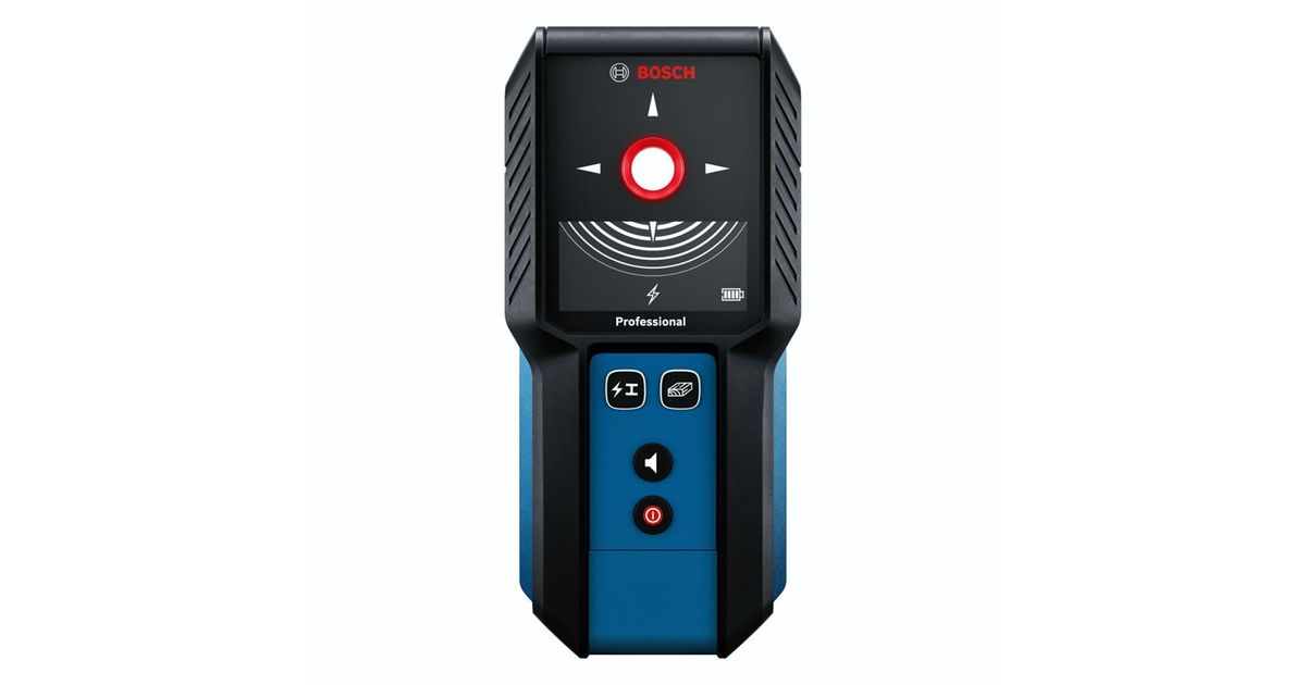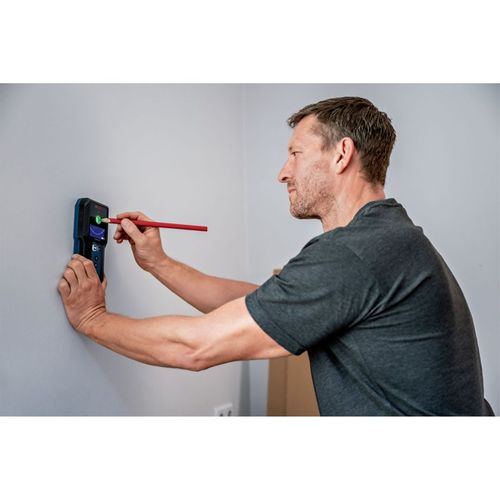 When drilling into the wall, you want to get the job done and make sure that you don’t encounter an obstacle. Our tracking device GMS 120-27 Professional allows an uncomplicated and intuitive location of objects. The location results are displayed by a signal indicator on the display and the colour-coded marking hole. The easy-to-use locator provides simple mode selection, and the marking hole allows you to mark exactly where objects have been located. The robust GMS 120-27 has been developed for rough construction sites and is equipped with dust and splash water protection according to IP54 and a shock-absorbing rubber housing.