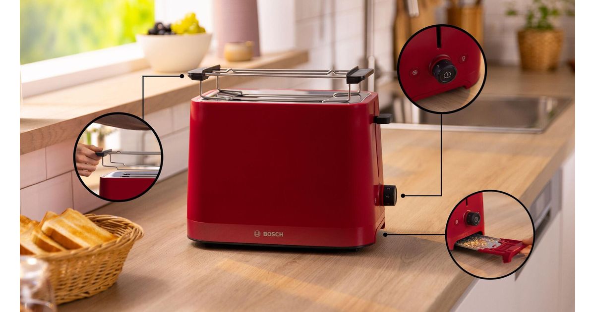 Bosch TAT3M124. Anzahl der Scheiben: 2 Scheibe(n), Produktfarbe: Rot, Steuerung: Drehregler. Leistung: 950 W, AC Eingangsspannung: 220 - 240 V, AC Eingangsfrequenz: 50/60 Hz. Kabel