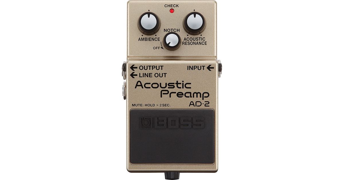 An acoustic preamp pedal for acoustic-electric guitarists with studio-quality sound for performing on any stage. Equipped with an advanced BOSS sound engine, this compact pedal packs sophisticated processing power that belies its small size and simple, intuitive interface. Acoustic Resonance reproduces the complex resonance characteristics of your unplugged tone, while Ambience provides pro-level reverberation perfectly optimized for acoustic guitar. The AD-2 also features essential stage tools such as a notch filter for feedback control, a balanced DI out for direct connection to a PA, and a convenient mute function for tuning and switching guitars. The dimensions of the pedal are 73 x 129 x 59 mm and the weight 450g.