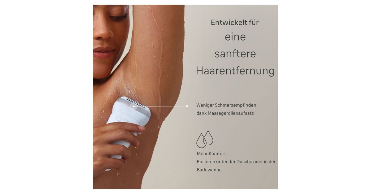 Experience long-lasting silky smooth skin and enjoy up to a month of silky smooth skin, all from the comfort of your home. The wide attachment of the epilator efficiently removes more hair in one stroke and captures even the shortest hairs (0.5 mm) that wax cannot grasp. The massage roller attachment ensures a comfortable epilation by reducing the sensation of pain, making the process more pleasant. Thanks to the Wet&Dry function, you can gently epilate in the bathtub or shower, resulting in less pain and more comfort.