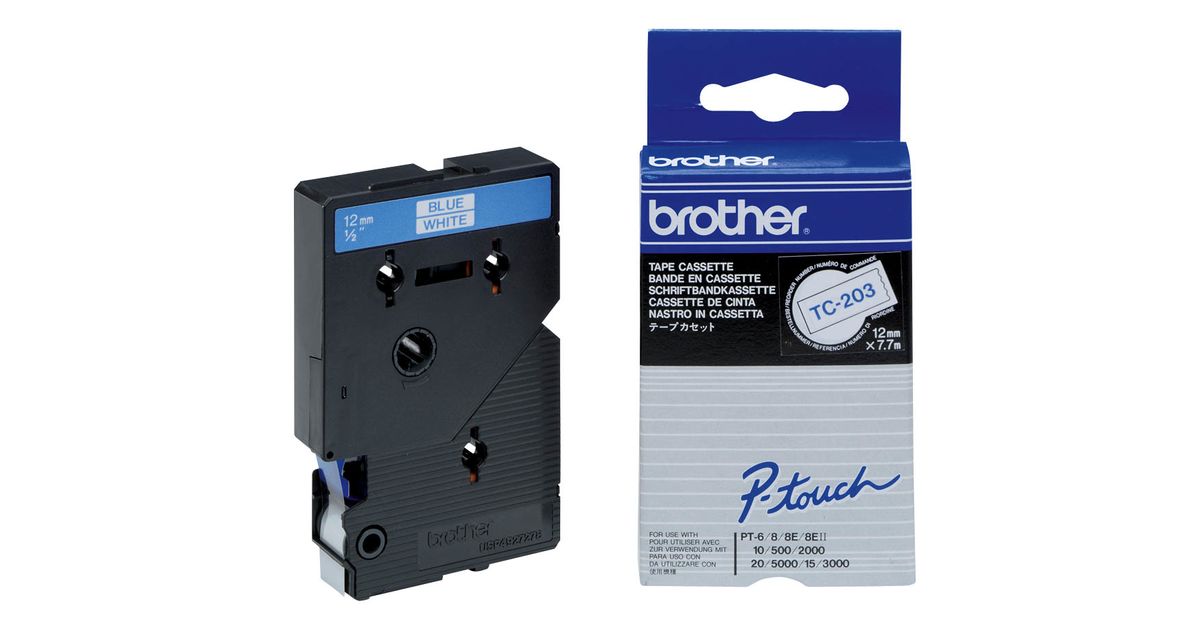 Brother TC-203, Sinine valgel taustal, TC, Brother, P-touch PT8E, PT500, PT2000, PT3000, PT5000, 1,2 cm, 7,7 m