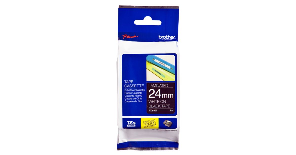Brother TZe-355, Valge mustal taustal, TZe, Termosiirde printimismeetod, Brother, PT-7600, PT-2430PC, PT-2700, PT-2730, PT-9600, PT-9700PC, PT-9800PCN, 2,4 cm