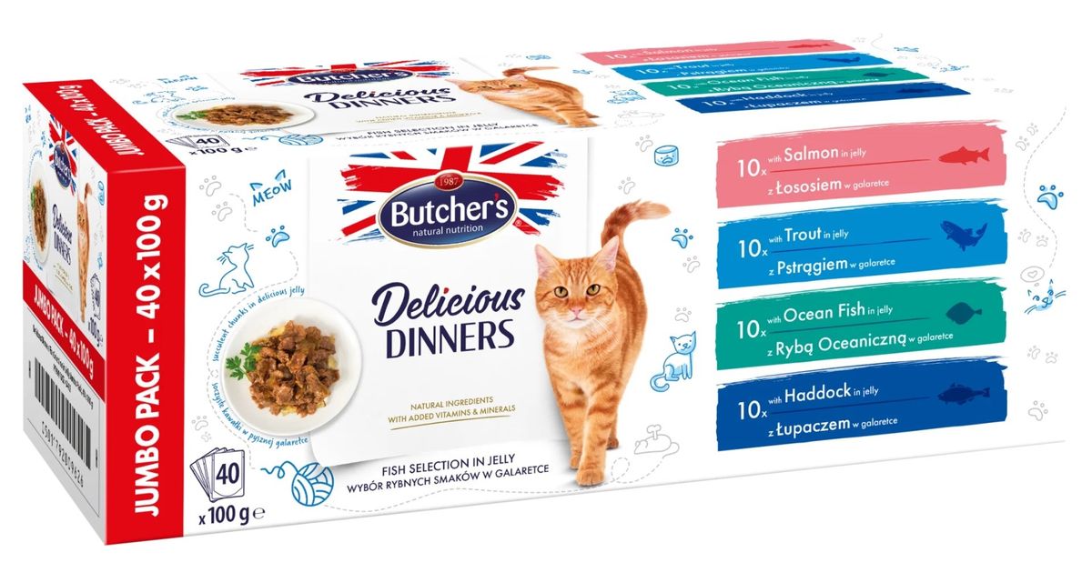 Butcher's Delicious Dinners Cat jumbo pack mix flavors dishes with fish in jelly cat food 40 x 100g