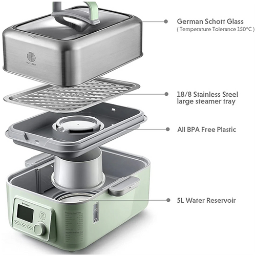 This innovative product has earned the prestigious IDEA Design Award, highlighting its superior quality. Despite its compact A4 size, the steamer boasts an impressive 5L capacity (can be increased to 10L capacity), making it a culinary powerhouse. With the performance equivalent to six small kitchen appliances.