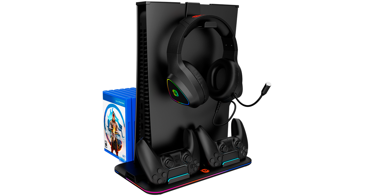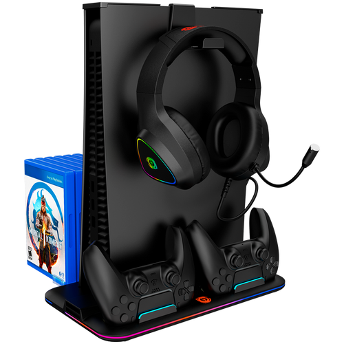 The stand also has adjustable RGB backlighting, because who doesn't love some cool lighting effects? There’s a game disc storage for six keep cases, dust-proof game accessory storage on top, and a headset holder. Phew, that's a lot of features!