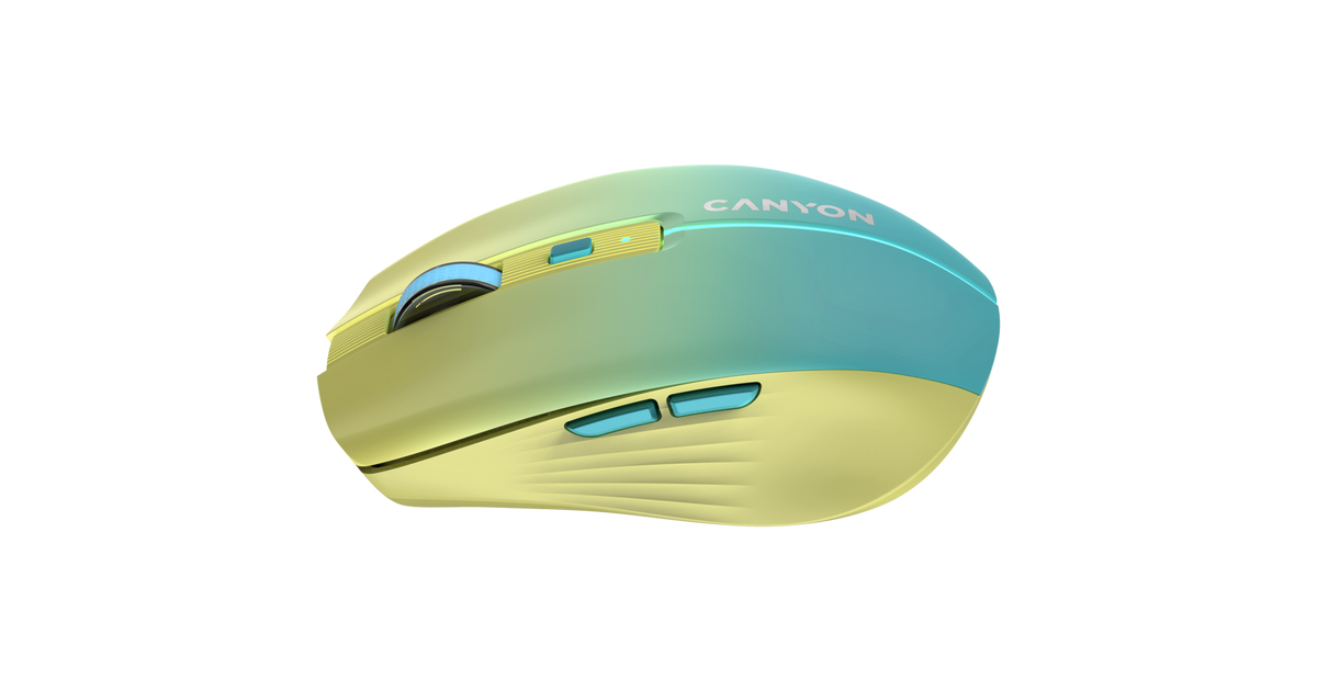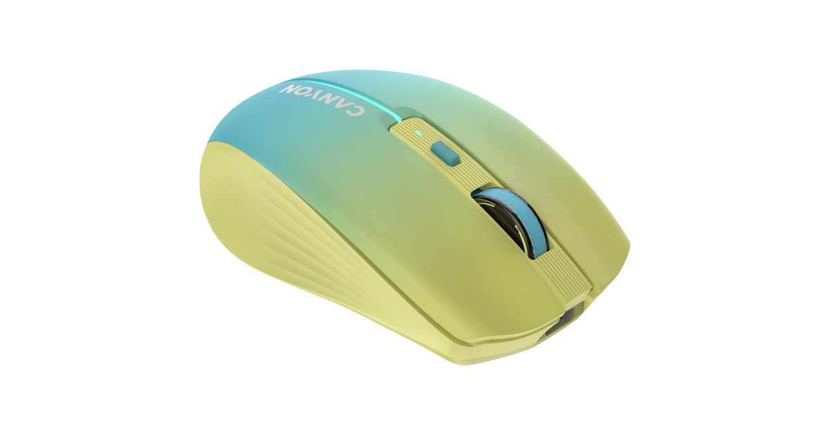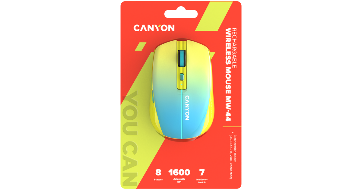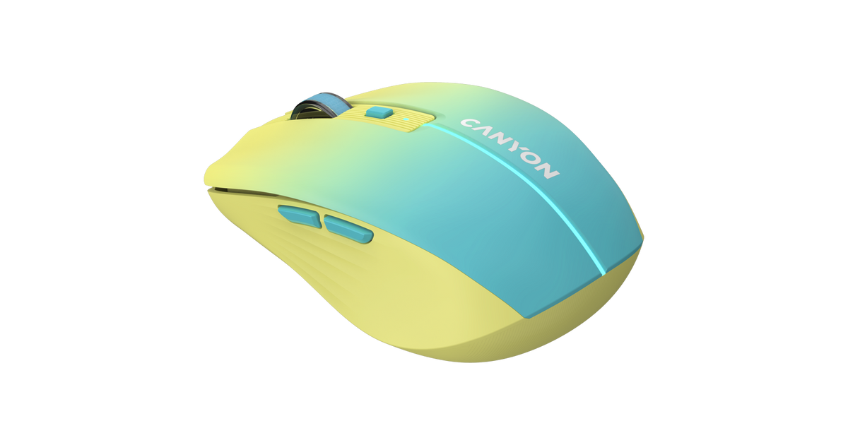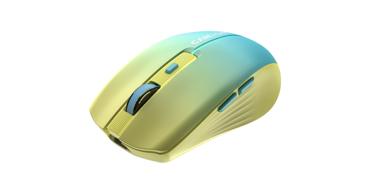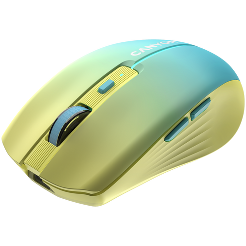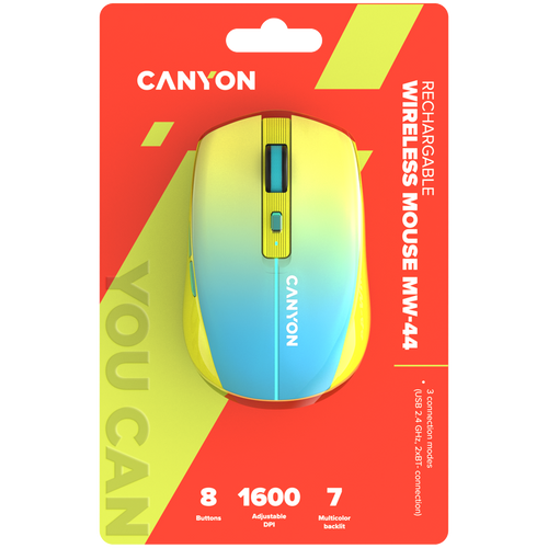 CANYON MW-44, 2 in 1 Wireless optical mouse with 8 buttons, DPI 800/1200/1600, 2 mode(BT/ 2.4GHz), 500mAh Lithium battery,7 single color LED light , Yellow-Blue(Gradient), cable length 0.8m, 102*64*35mm, 0.075kg