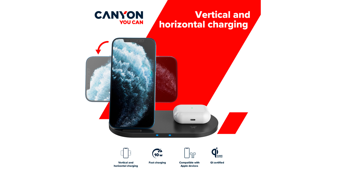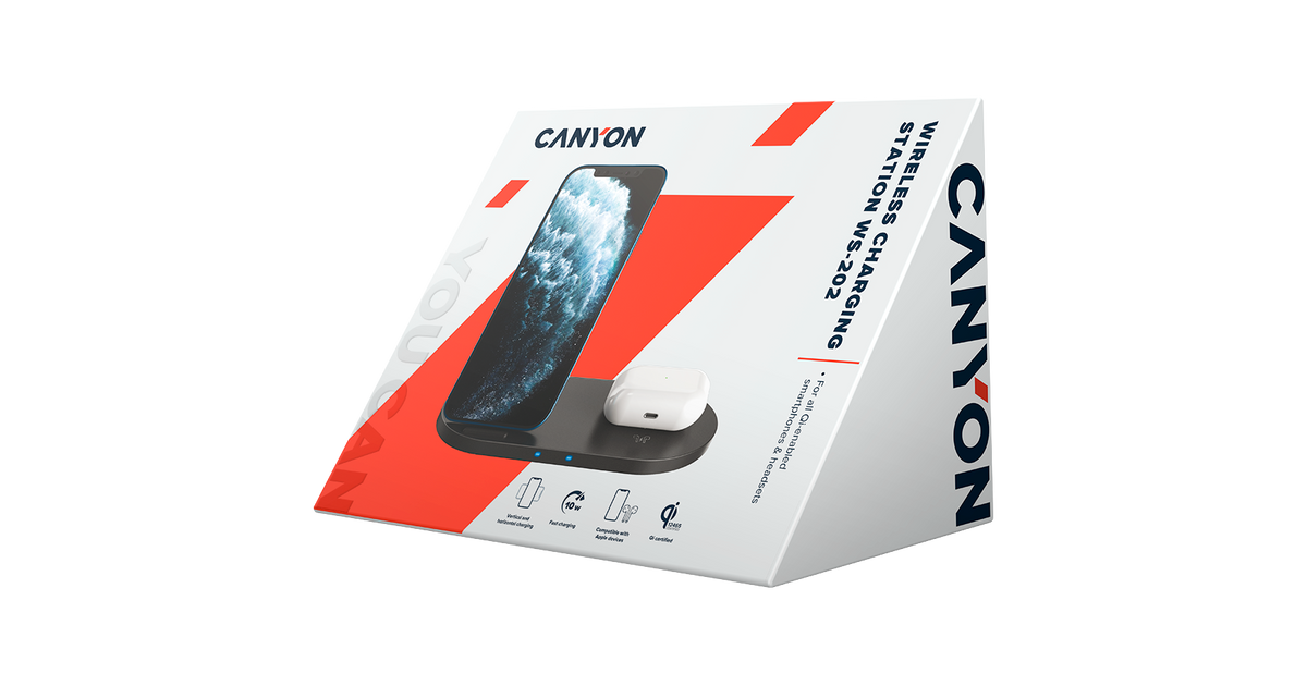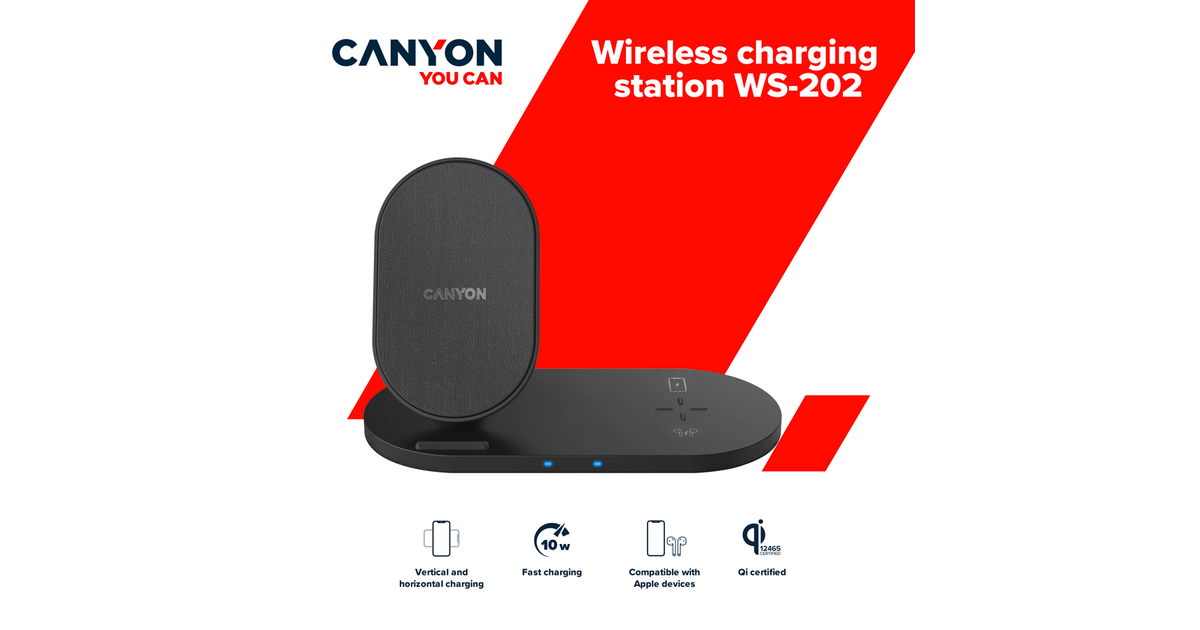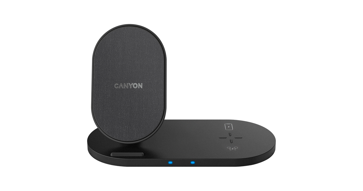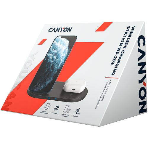 CANYON WS-202, 2in1 Wireless charger, Input 5V/3A, 9V/2.67A, Output 10W/7.5W/5W, Type c cable length 1.2m, PC+ABS,with PU part ,180*86*111.1mm, 0.185Kg,Black