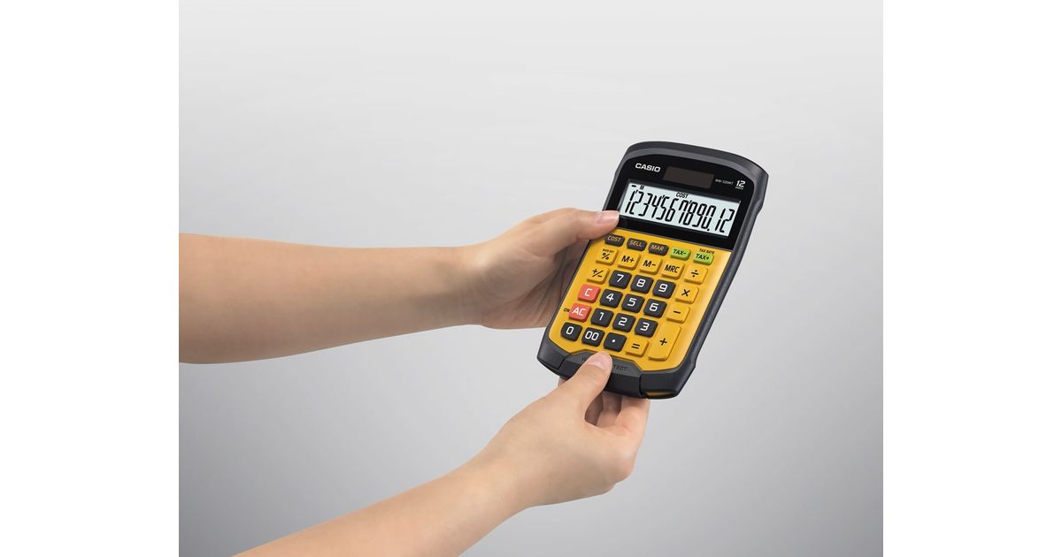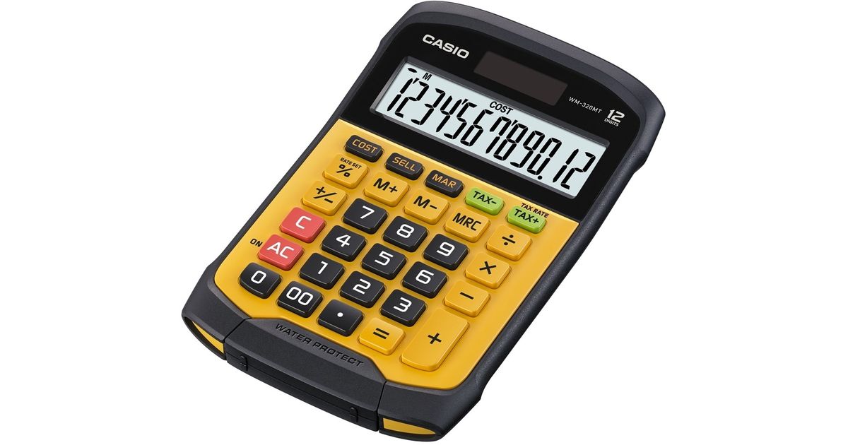 Casio WM-320MT, Tasku, Ekraanikalkulaator, 12 numbrid, 1 joont, Aku/päikesepatarei, Must, Kollane