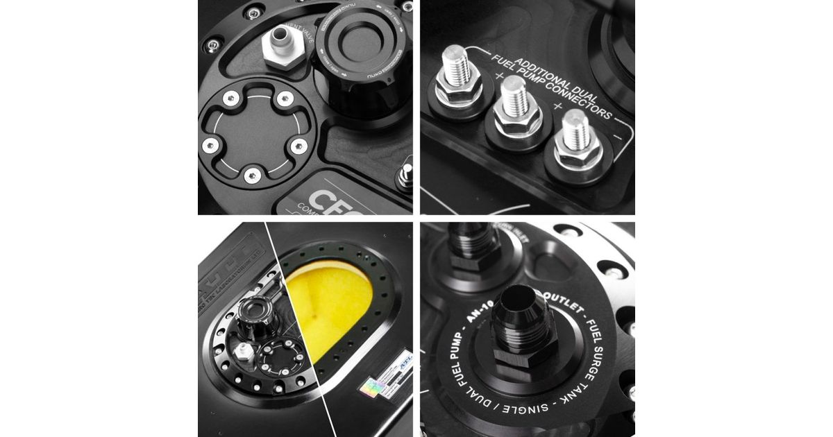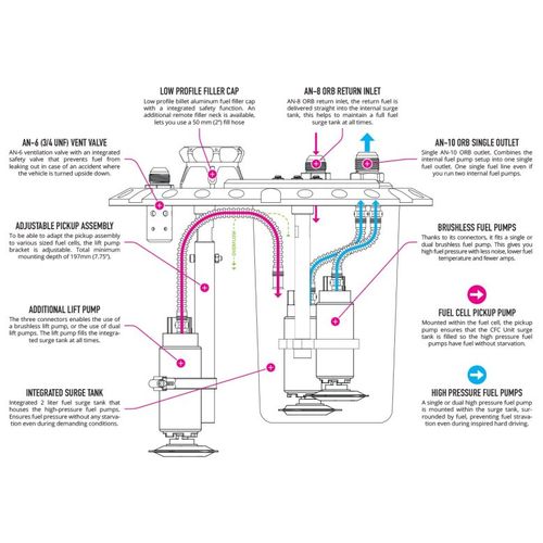 With all the needed fuel pumps mounted within the fuel cell itself, this product is the only thing you need. The simplicity of its design frees up space and weight while increasing safety, as fewer fuel line fittings are necessary and no external fuel pumps are used. With its unique low-profile billet design, this is the most lightweight solution on the market and lets you save crucial weight in your racecar.
