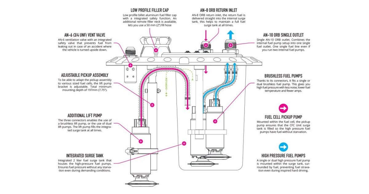The single fuel pump mounted in the fuel cell functions as a feeder fuel pump, ensuring that the high-pressure fuel pumps within the oversized 2.0-liter (0.53 gallons) surge tank always have enough fuel to maximize flow and minimize the risk of starvation, which could seriously harm your engine. For more information, view the product manual. The brushless fuel pump edition CFC Unit is delivered with everything you need to install the fuel pumps of your selection, but we recommend adding one of our fuel pump mounting kits for optimal functionality. All fuel pumps are securely mounted in all conditions thanks to the billet fuel pump brackets.