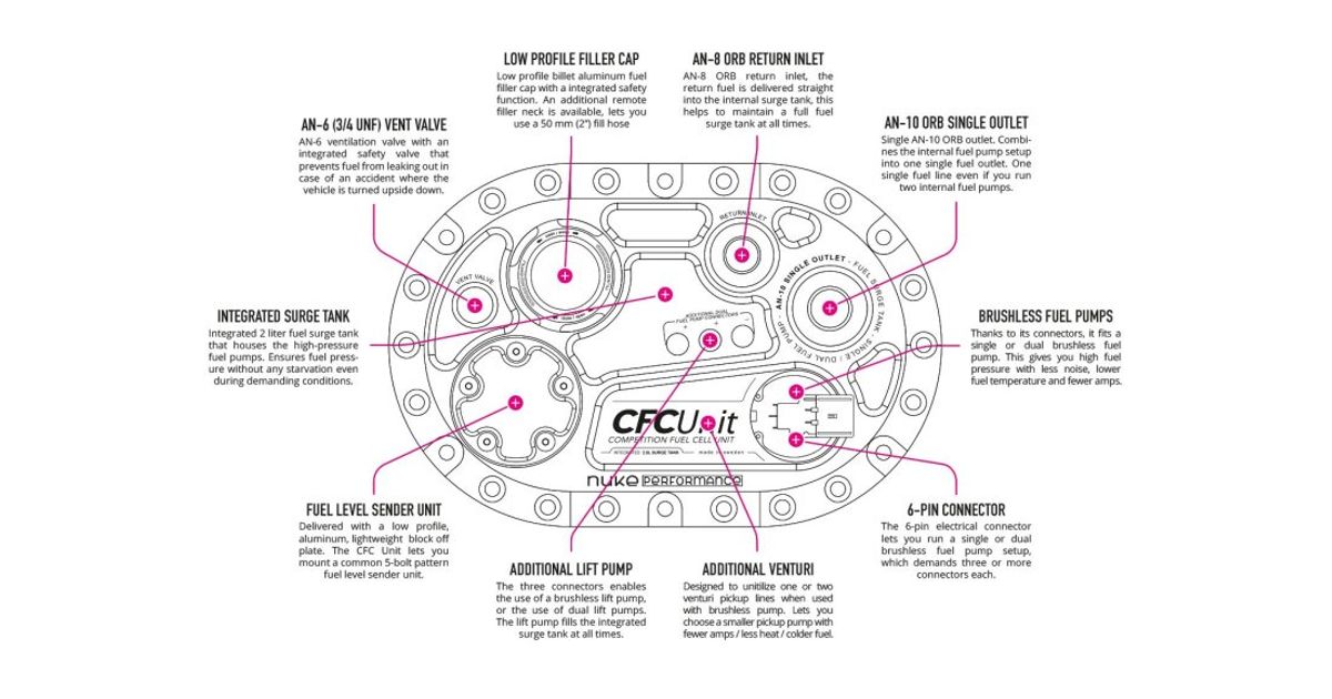 The Nuke Performance CFC Unit eliminates the need for an external surge tank which is also needed when running a fuel cell, making it is a perfect solution for fuel-injected systems. Used with PWM control in combination with the CFC Unit prevents emerging heat when running numerous fuel pumps. This is the best way to eliminate the fuel starvation that may otherwise occur in motorsports. And with the new design that accommodates brushless fuel pump installation, it´s also possible to mount venturi pickup points that ensure a full surge tank even at extremely low fuel levels.