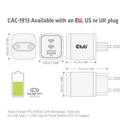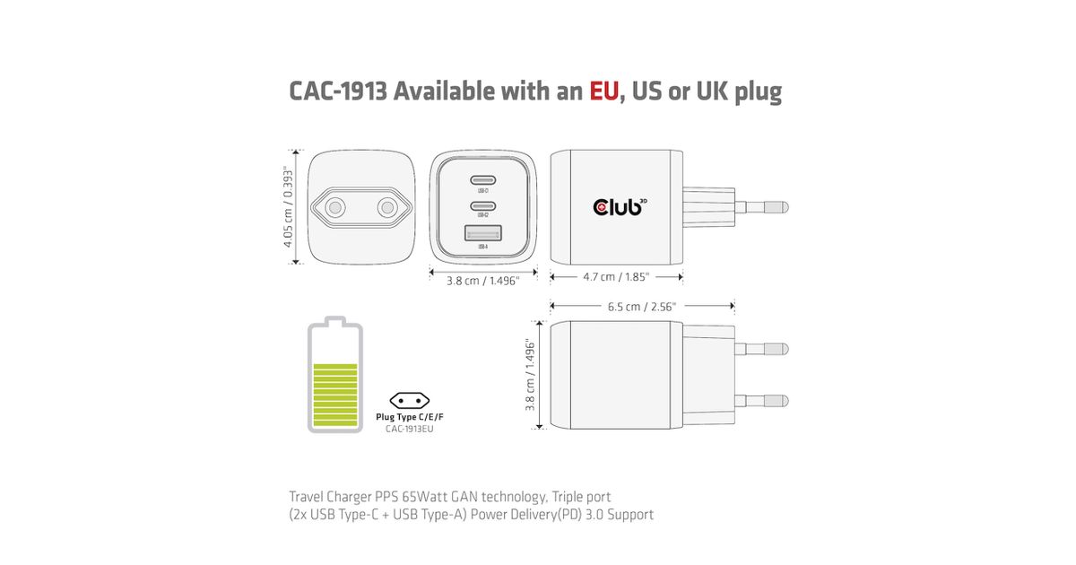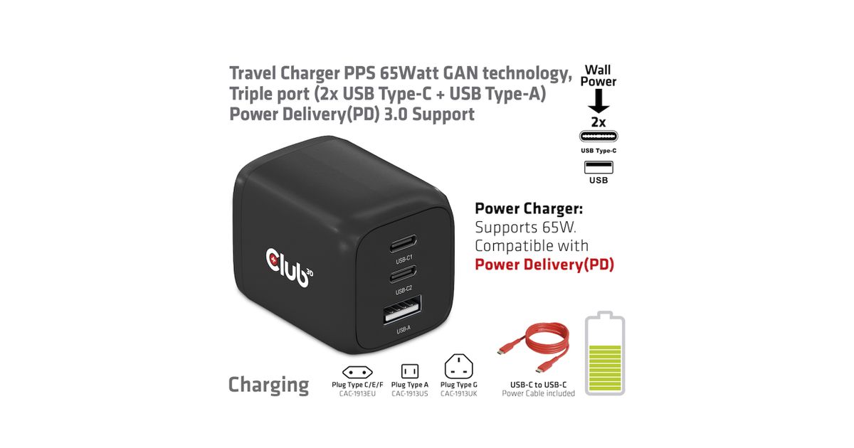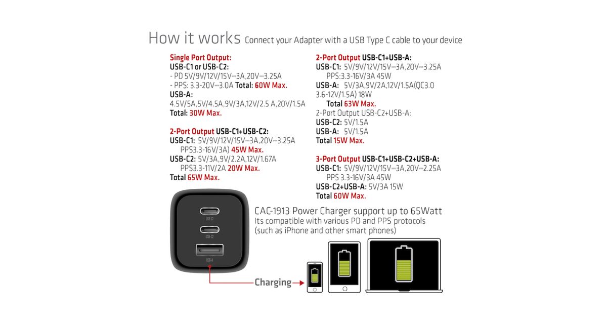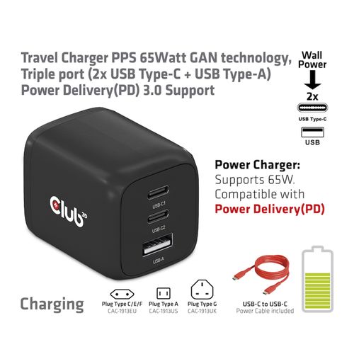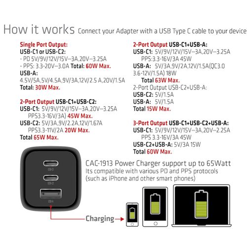| Karbi sisu | CAC-1913 Travel Charger PPS 65Watt GAN technology, Triple port(2x USB Type-C + USB Type-A) Power Delivery(PD) 3.0 Support 1x RED (Power ONLY) USB Type-C cable(1 m / 3.28 ft) for connecting to Host |