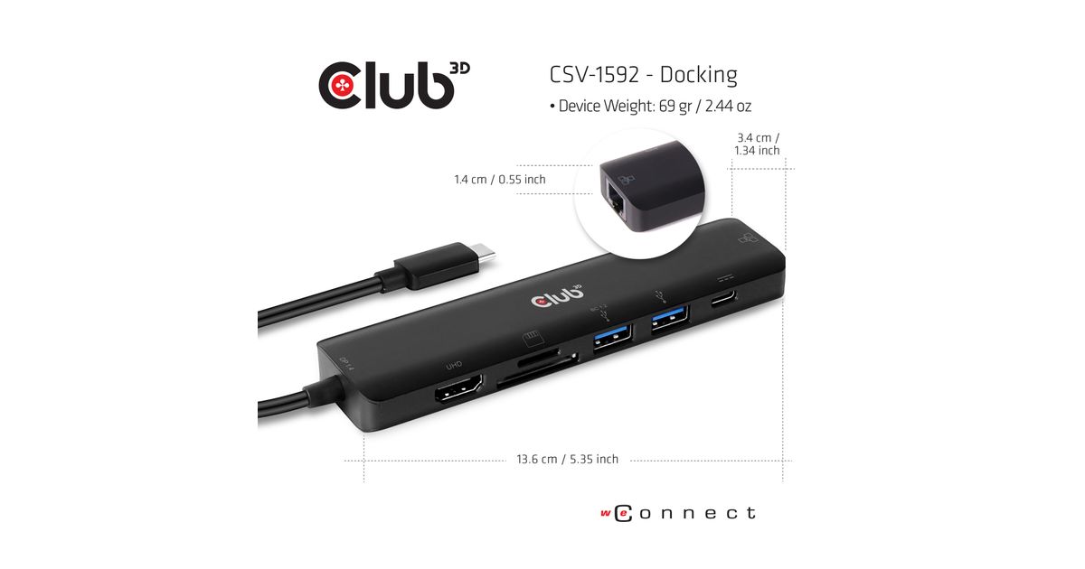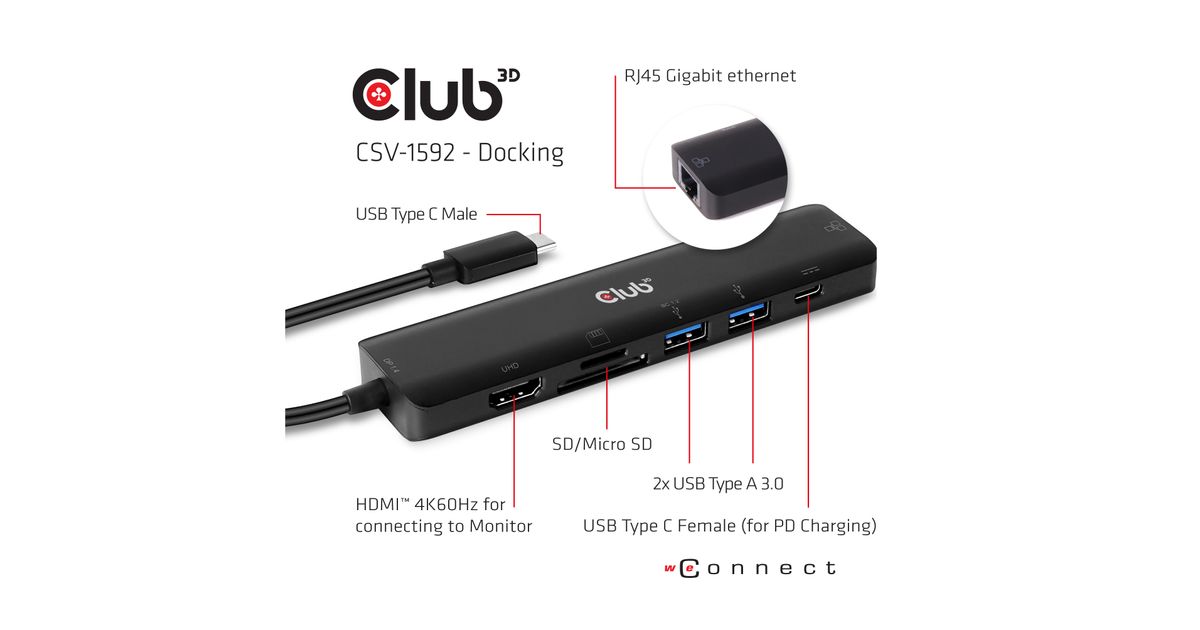 CLUB3D CSV-1592, Dokkimine, 100 W, 10,100,1000 Mbit/s, Must, MicroSD (TransFlash), MicroSDHC, MicroSDXC, MiniSD, SD, SDHC, 4K Ultra HD