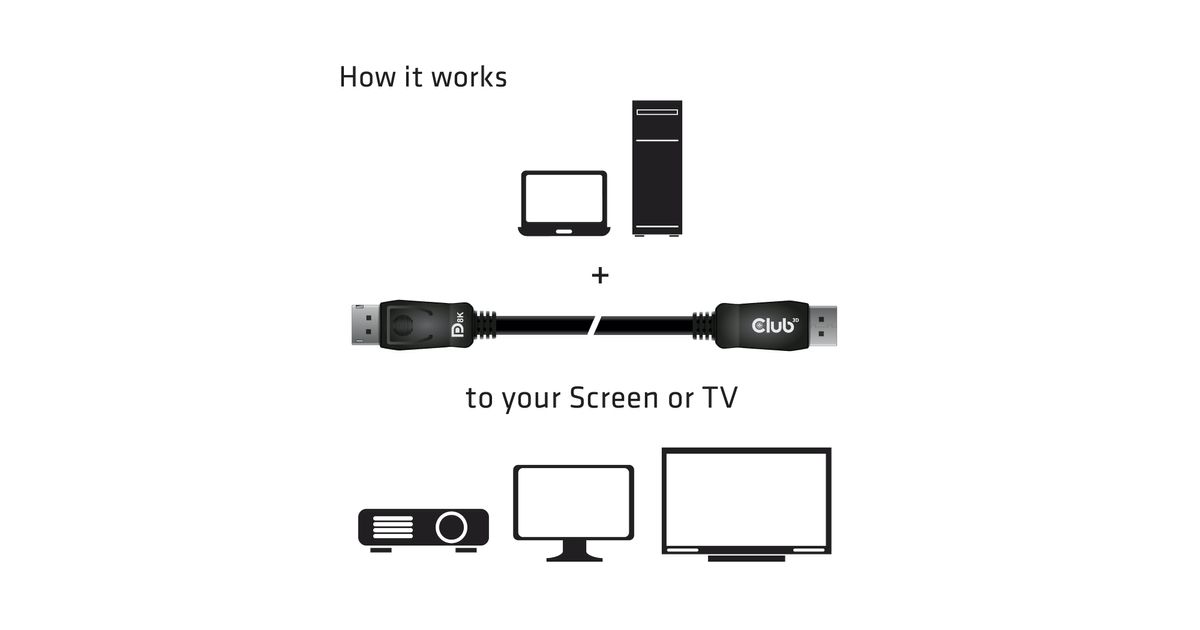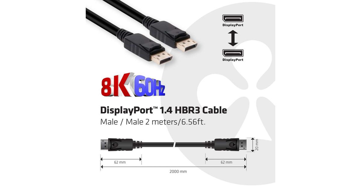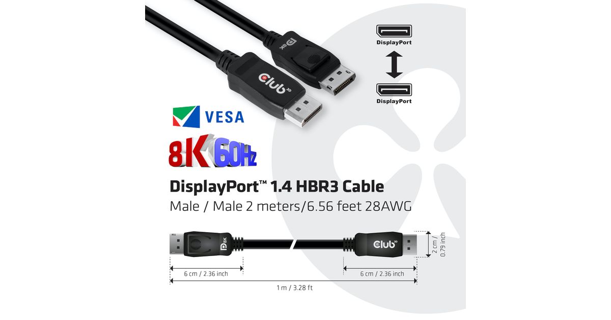 CLUB3D DisplayPort 1.4 HBR3 Cable 2m/6.56ft M/M 8K60Hz, 2 m, DisplayPort, DisplayPort, Meessoost, Meessoost, 7680 x 4320 pikslit