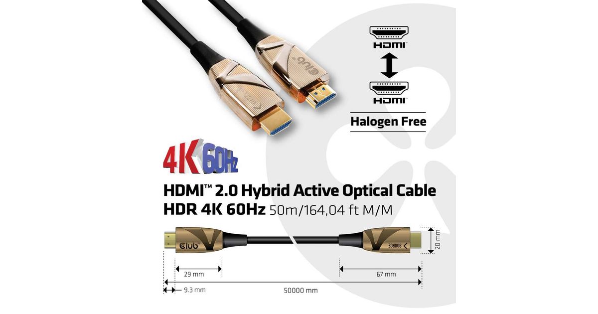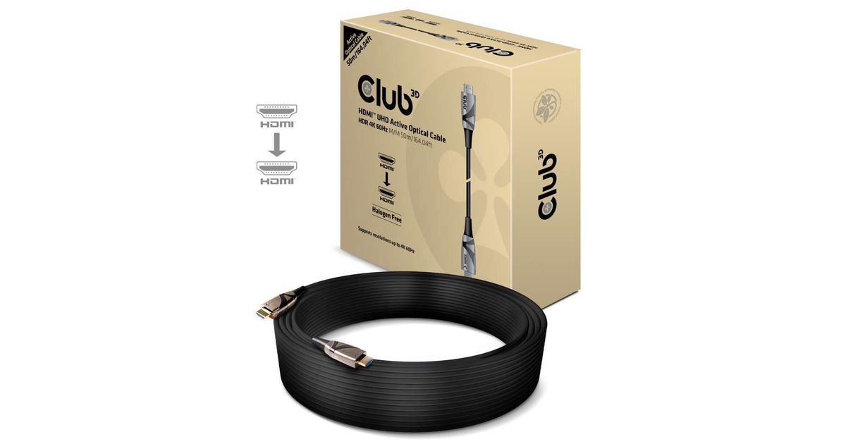 CLUB3D HDMI 2.0 UHD Active Optical Cable HDR 4K 60Hz M/M 50m/164,04ft, 50 m, HDMI tüüp A (Standard), HDMI tüüp A (Standard), 7096 x 2160 pikslit, 18 Gbit/s, Must, Pronks