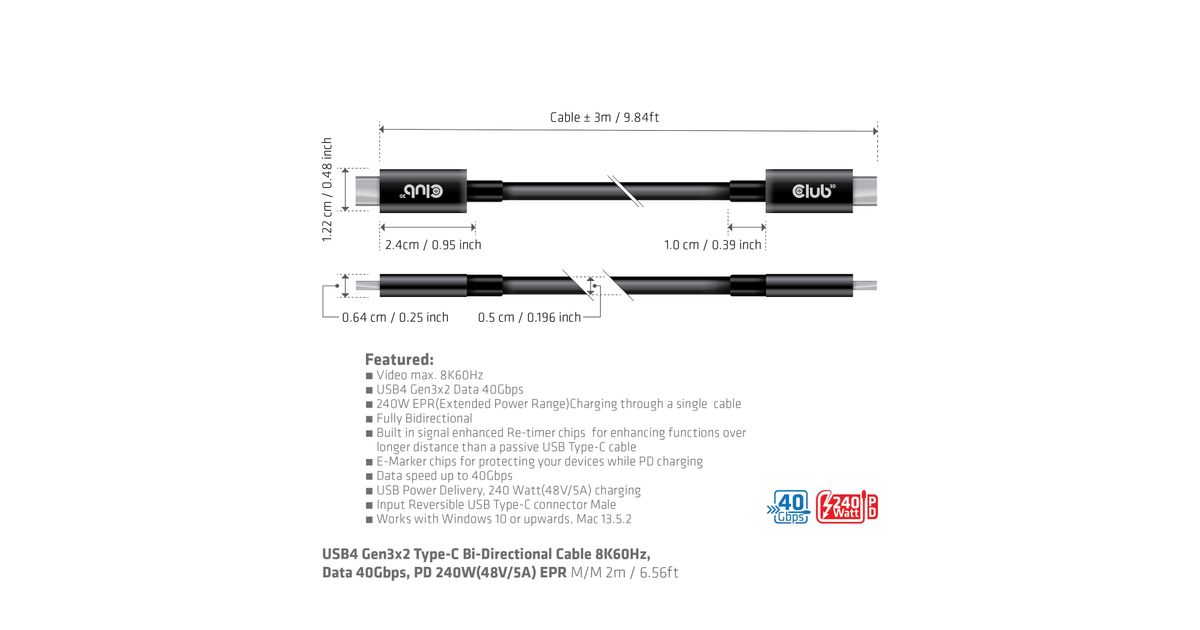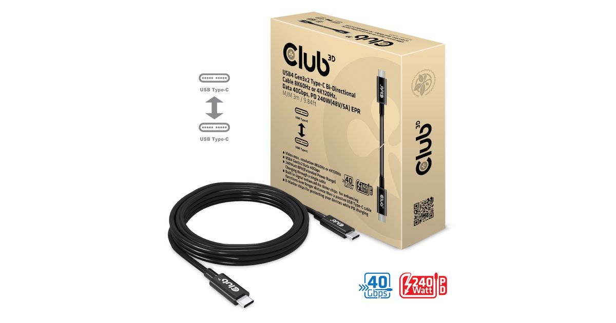 Club3D Kabel USB 4 Typ C PD 240W / 8K / 40Gbps 3m St/St retail