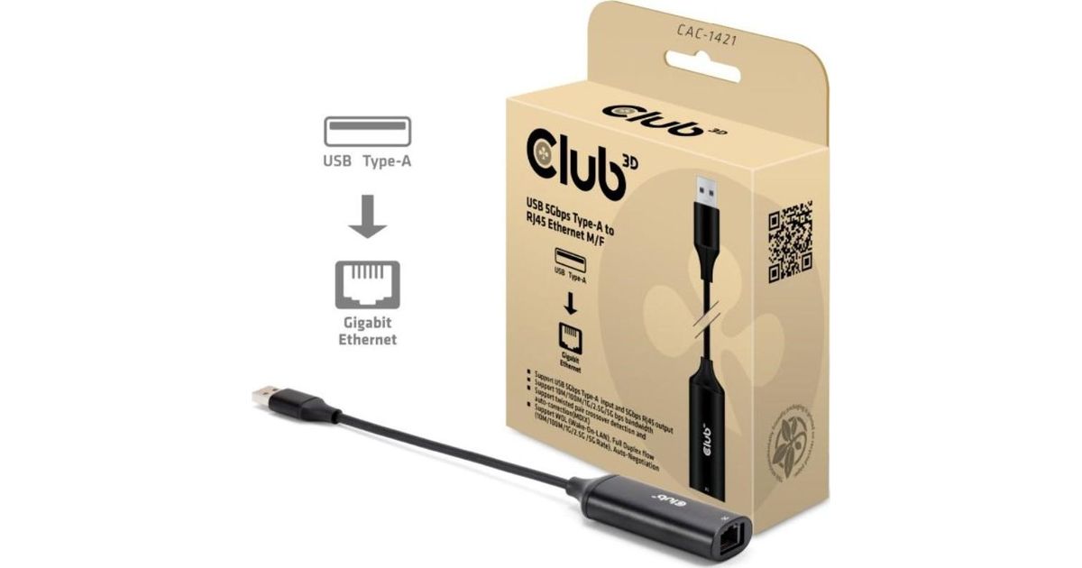 CLUB3D USB 5GBPS TYPE-A TO RJ45 ETHERNET M F ADAPTER