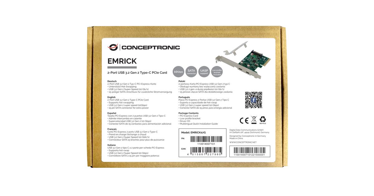 Conceptronic EMRICK07G, PCIe, USB 3.2 Gen 2 (3.1 Gen 2), PCI 2.0, SATA 15-pin, Roheline, PC