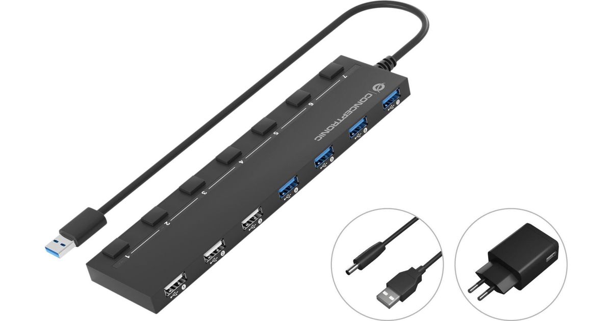 Conceptronic HUBBIES09BP, USB 3.2 Gen 1 (3.1 Gen 1) Type-A, USB 2.0, USB 3.2 Gen 1 (3.1 Gen 1) Type-A, 5000 Mbit/s, Must, 0,9 m, Hiina