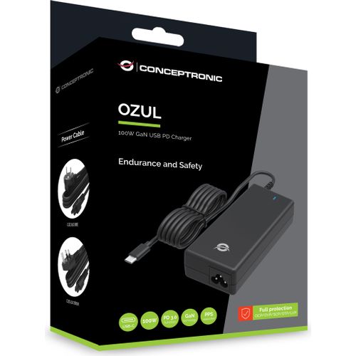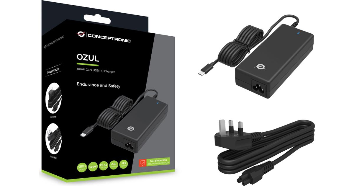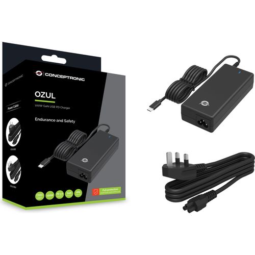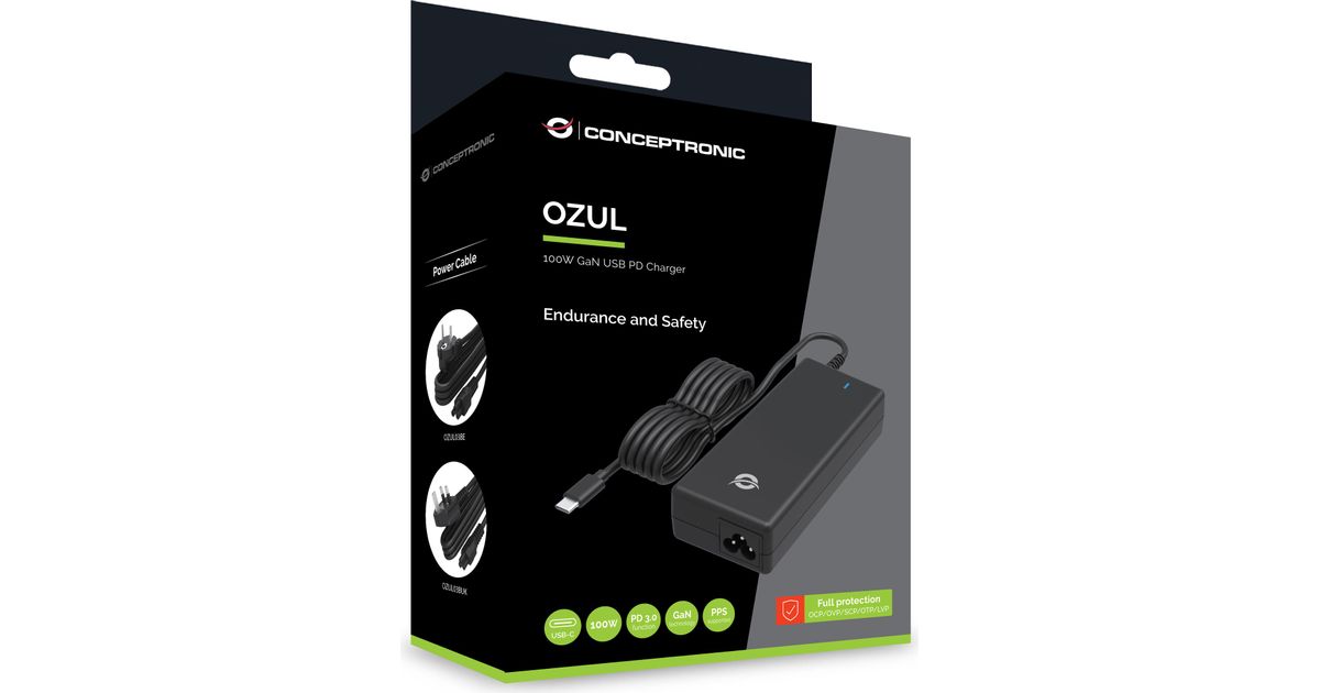 Conceptronic OZUL03BUK 100W GaN USB PD Desktop-Ladegerät, Integriertes USB-C-Kabel, UK-Stecker. Zweck: Universal, Netzteiltyp: Drinnen, Eingangsspannung: 100 - 240 V. USB-Stecker: