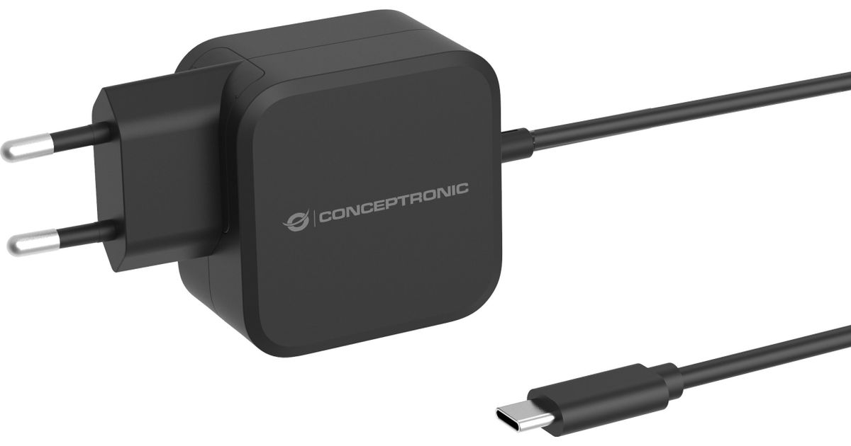 Conceptronic OZUL04BE 67W GaN USB-PD-Ladegerät, Eingebautes USB-C-Kabel. Aufladetyp: Drinnen, Energiequelle: AC, Aufladekompatibilität: Universal. Eingangsspannung: 100 - 240 V, Ma
