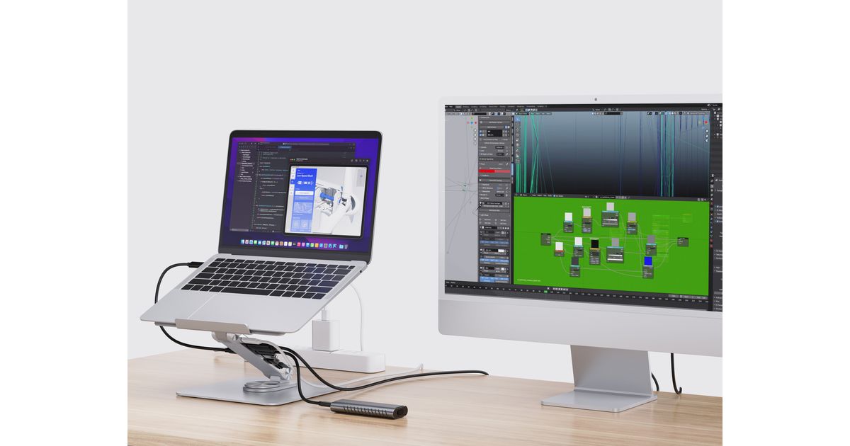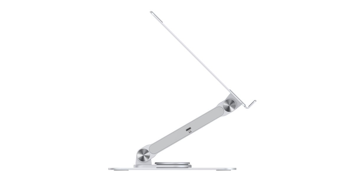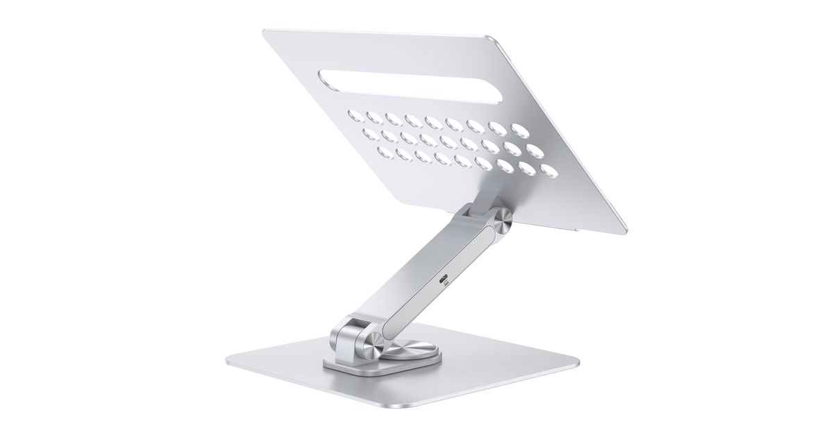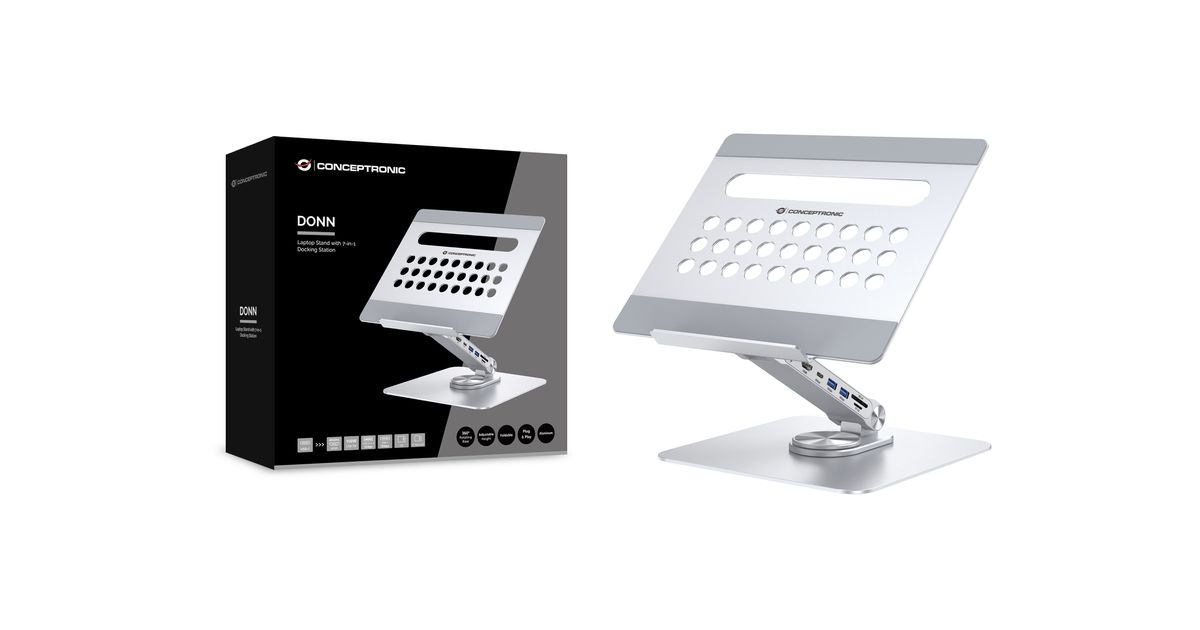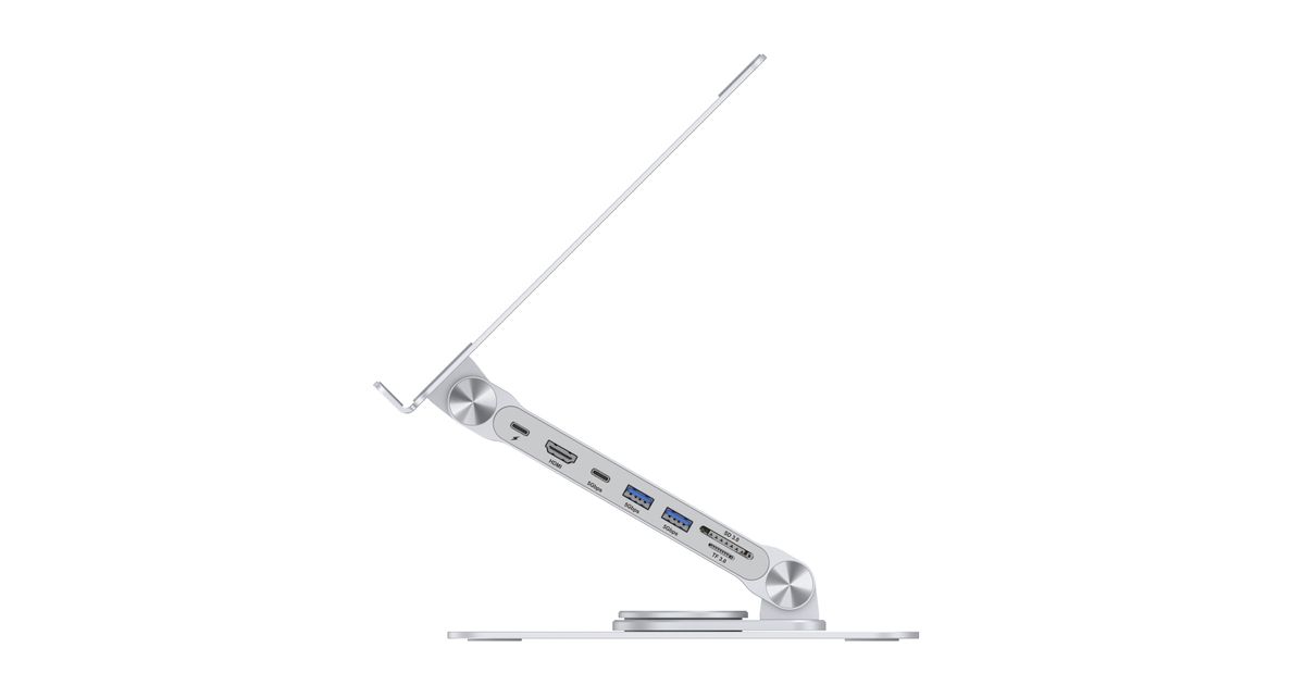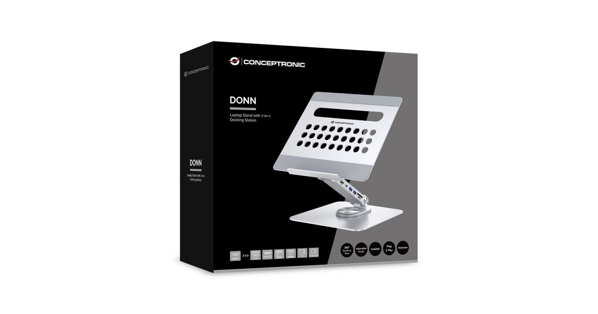 Verbessere dein Erlebnis mit dem Laptop-Ständer mit unserer integrierten 7-in-1-Dockingstation, die die USB-C-Fähigkeiten deines Geräts erweitert. Der Ständer bietet eine verstellbare Höhe und einen Winkel für optimale ergonomische Positionierung sowie eine 360° drehbare Basis für flexible Arbeitspositionen.